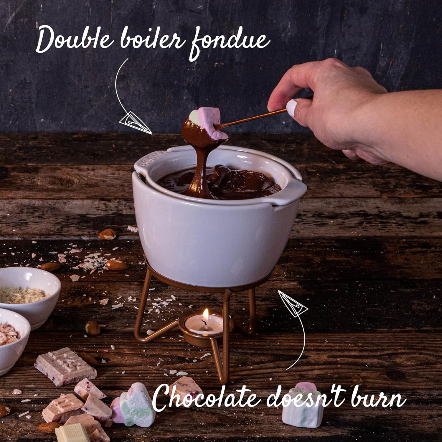 No burnt chocolate: our foolproof melting pot keeps your chocolate Warm without burning.