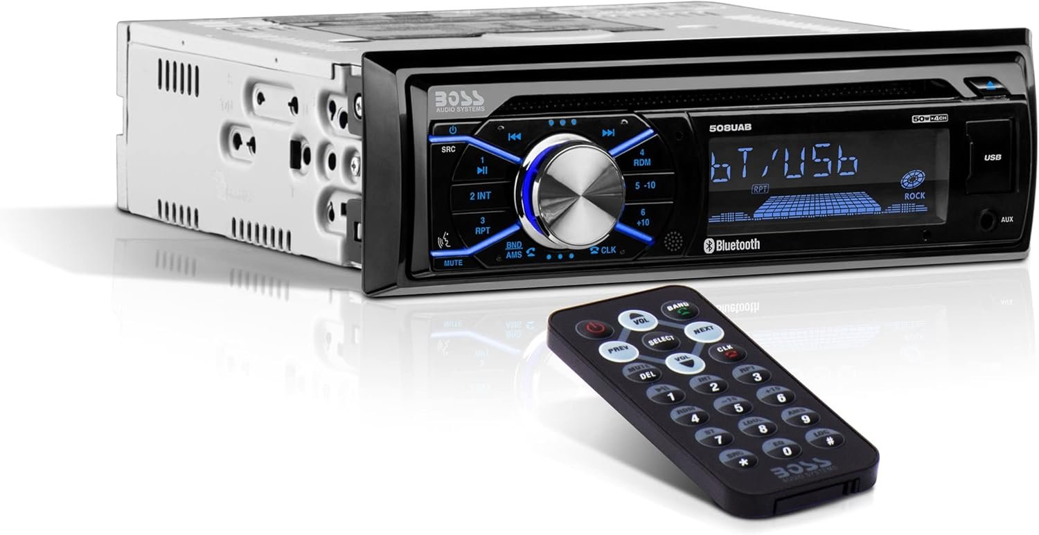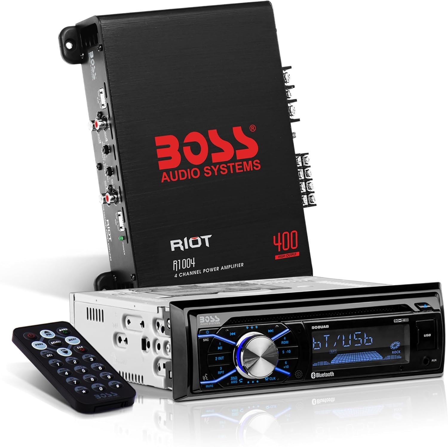 BOSS Audio Systems 508UAB Car Stereo With Bluetooth – Single Din, CD Player, Aux-in, USB, Built-in Microphone, AM/FM Radio Receiver + BOSS Audio Systems R1004 Riot Series 4 Channel Amplifier Car Audio – Class A/B, 400 High Output, 2-8 Ohm Stable, High/Low Level Inputs, Full Range