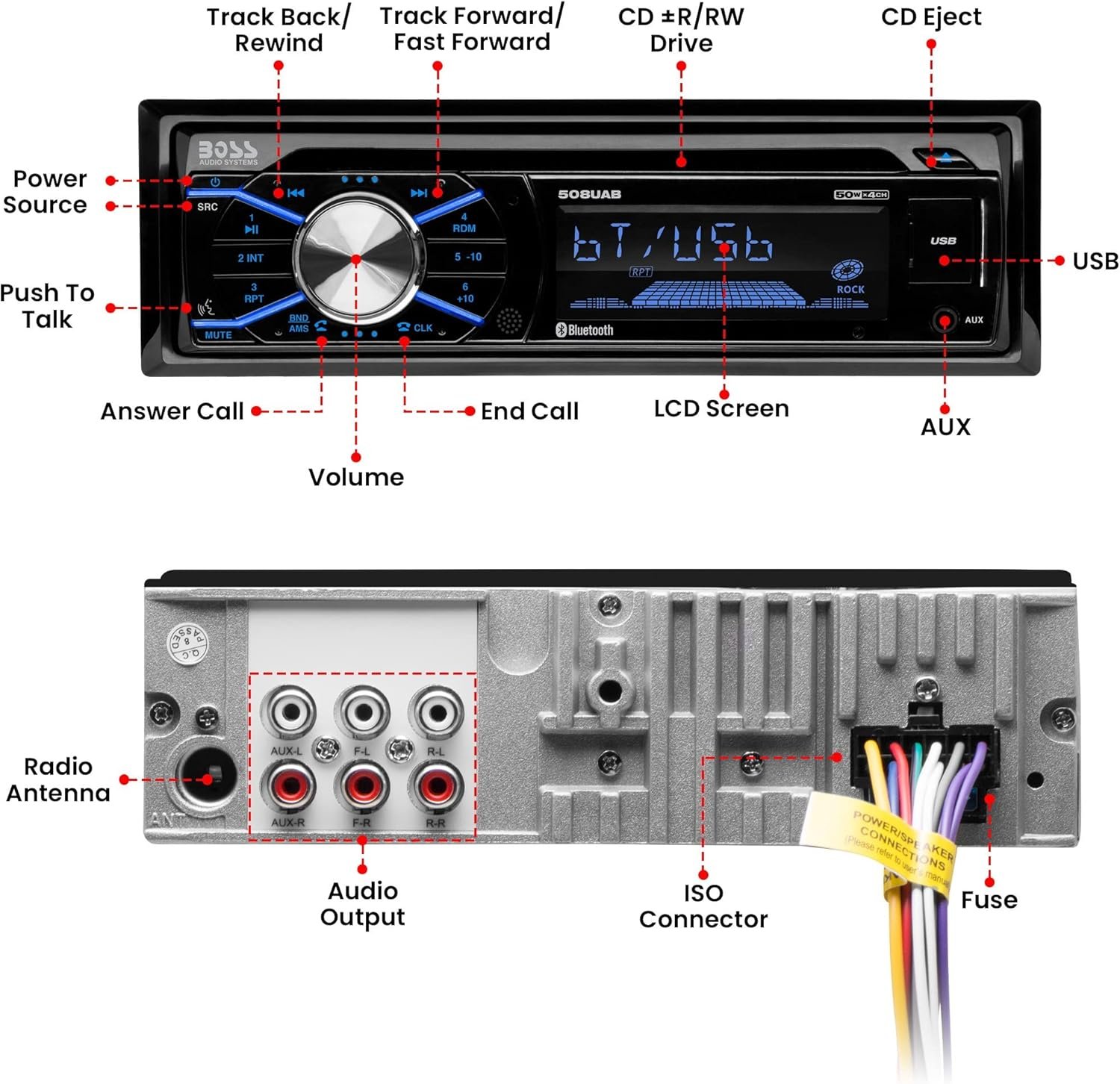 Stereo Featurues: Single-DIN Fit Bluetooth Hands-free AM/FM Receiver Switchable US & EU Tuner Frequencies Push-To-Talk Wireless Remote Control Update via USB 50 Watts x 4 Channel