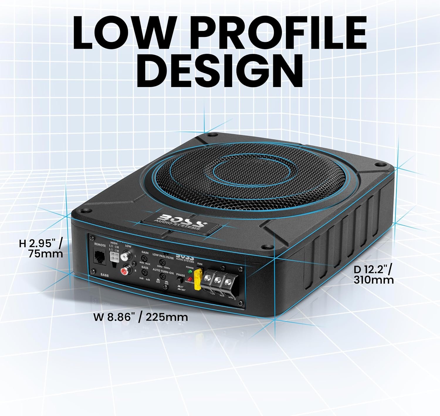 Sub Features: 800 Watts Peak Power Low Profile 8” Rubber Surround Monoblock Class A/B Topology PWM MOSFET Power Supply RCA & Speaker Level Inputs Low Pass Filter Bass Boost Phase Control Remote Subwoofer Control LED Status Indicator Auto Turn-On (High Inputs) Thermal, Short and Overload Protection Circuits