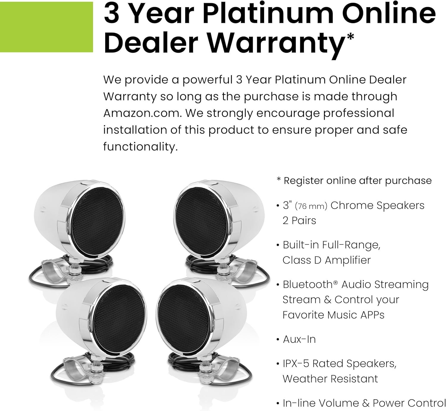Speakers – The two 3-inch chrome full range speakers have adjustable brackets that will fit handlebars ranging from .75” to 1.5”