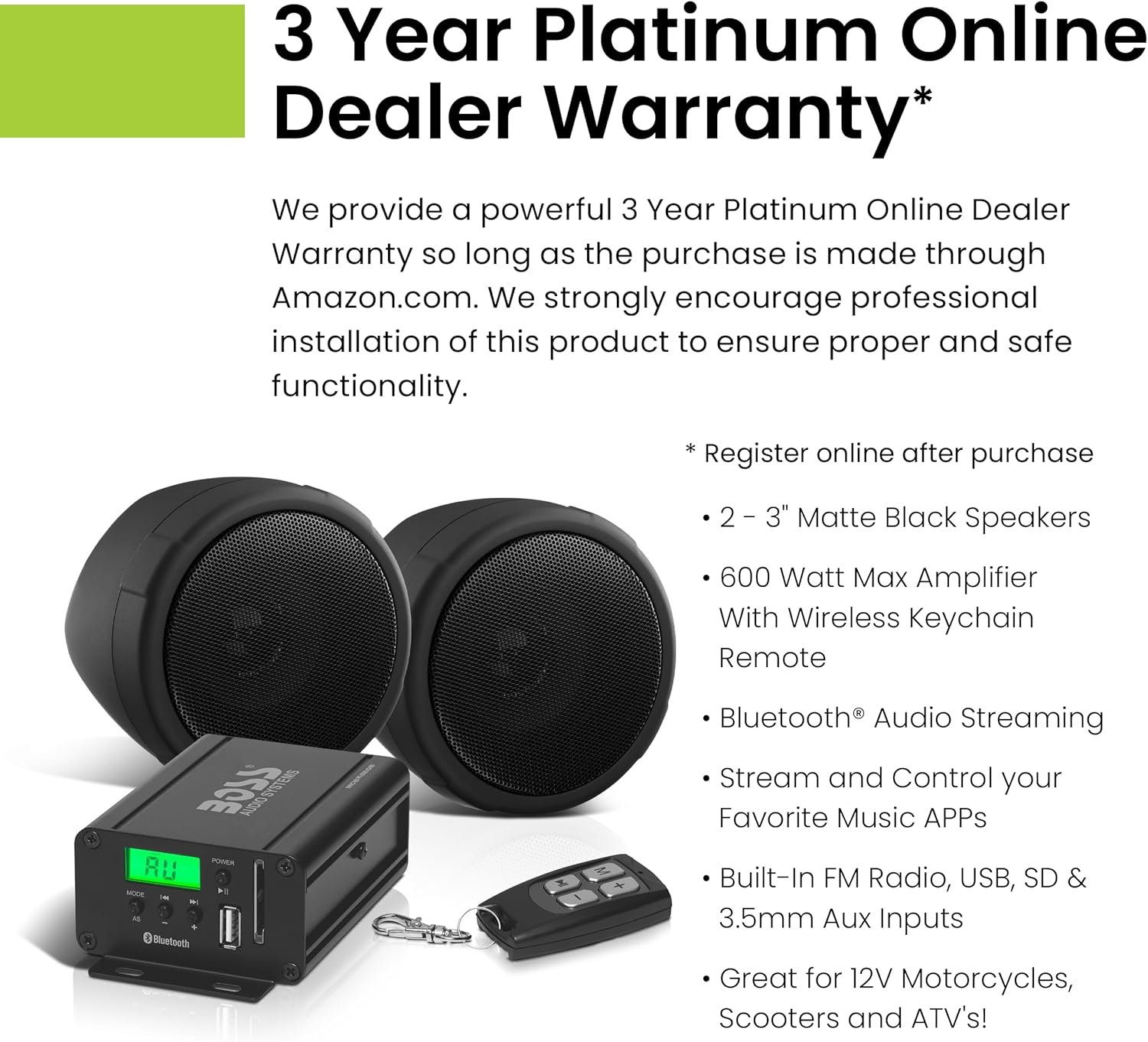 Warranty – BOSS Audio Systems provides a powerful 3-year platinum online dealer warranty so long as the purchase is made through Amazon.com. We strongly encourage professional installation of this product to ensure proper and safe functionality