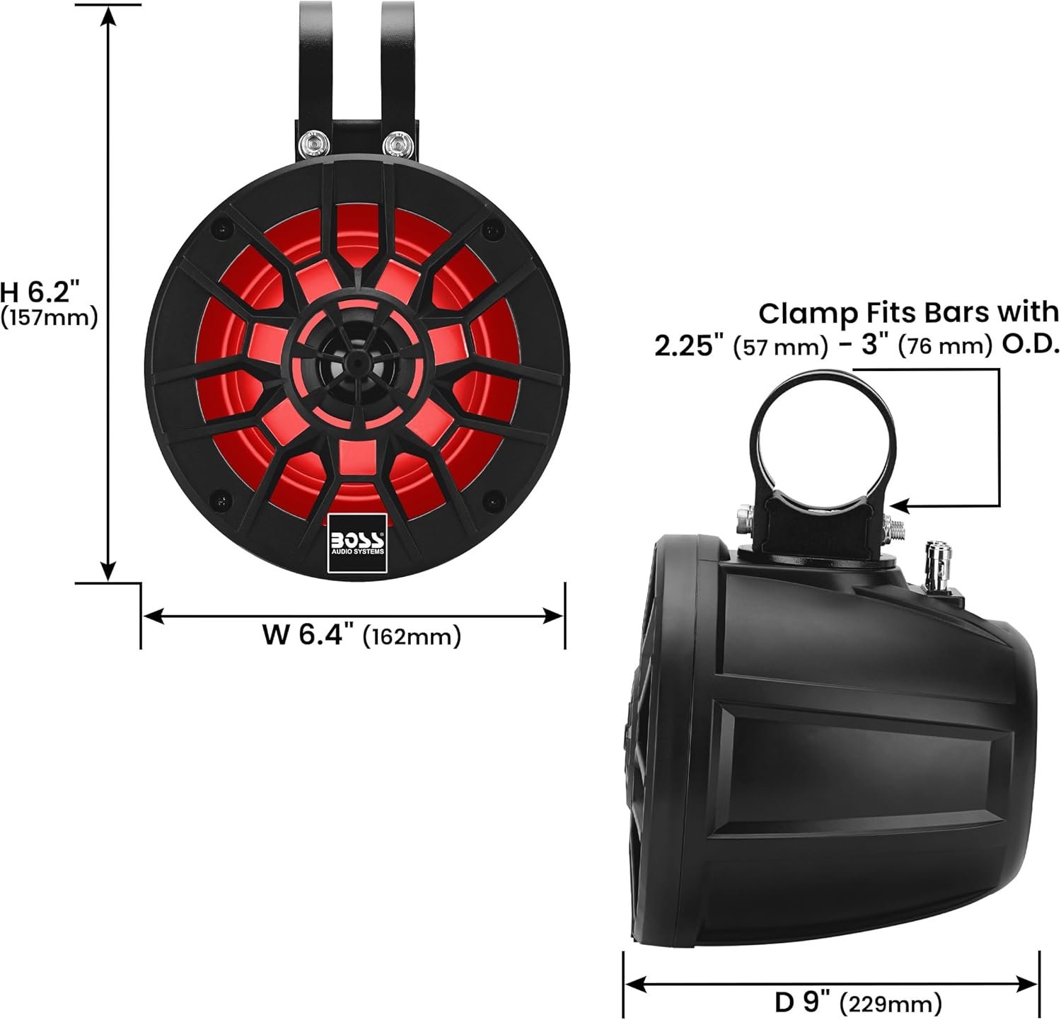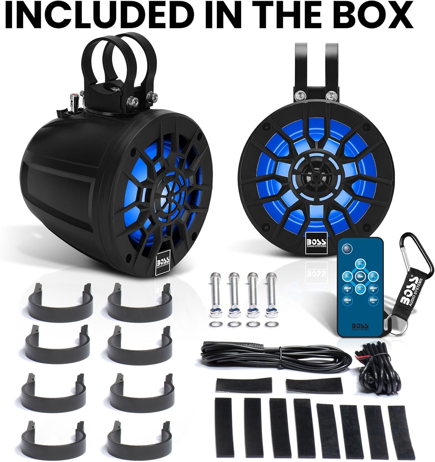 Mounting Hardware – The MPWT50RGB comes with low profile dual-strap swivel clamps. Included sizes: 1.5″–1.75” + 1.875”–2″ O.D.
