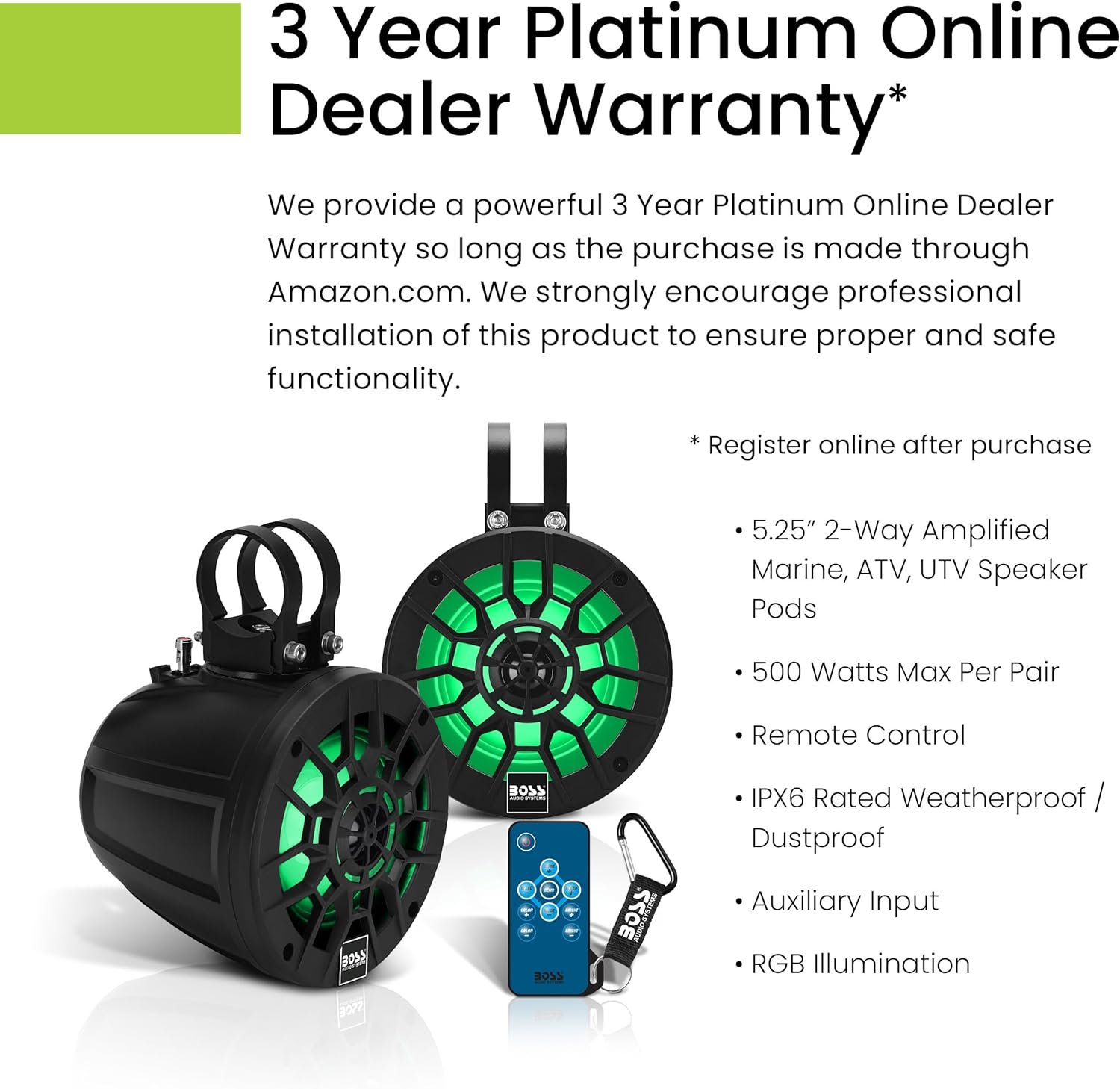 BOSS Audio Systems provides a powerful 3-year platinum online dealer warranty so long as the purchase is made through Amazon.com. We strongly encourage professional installation of this product to ensure proper and safe functionality