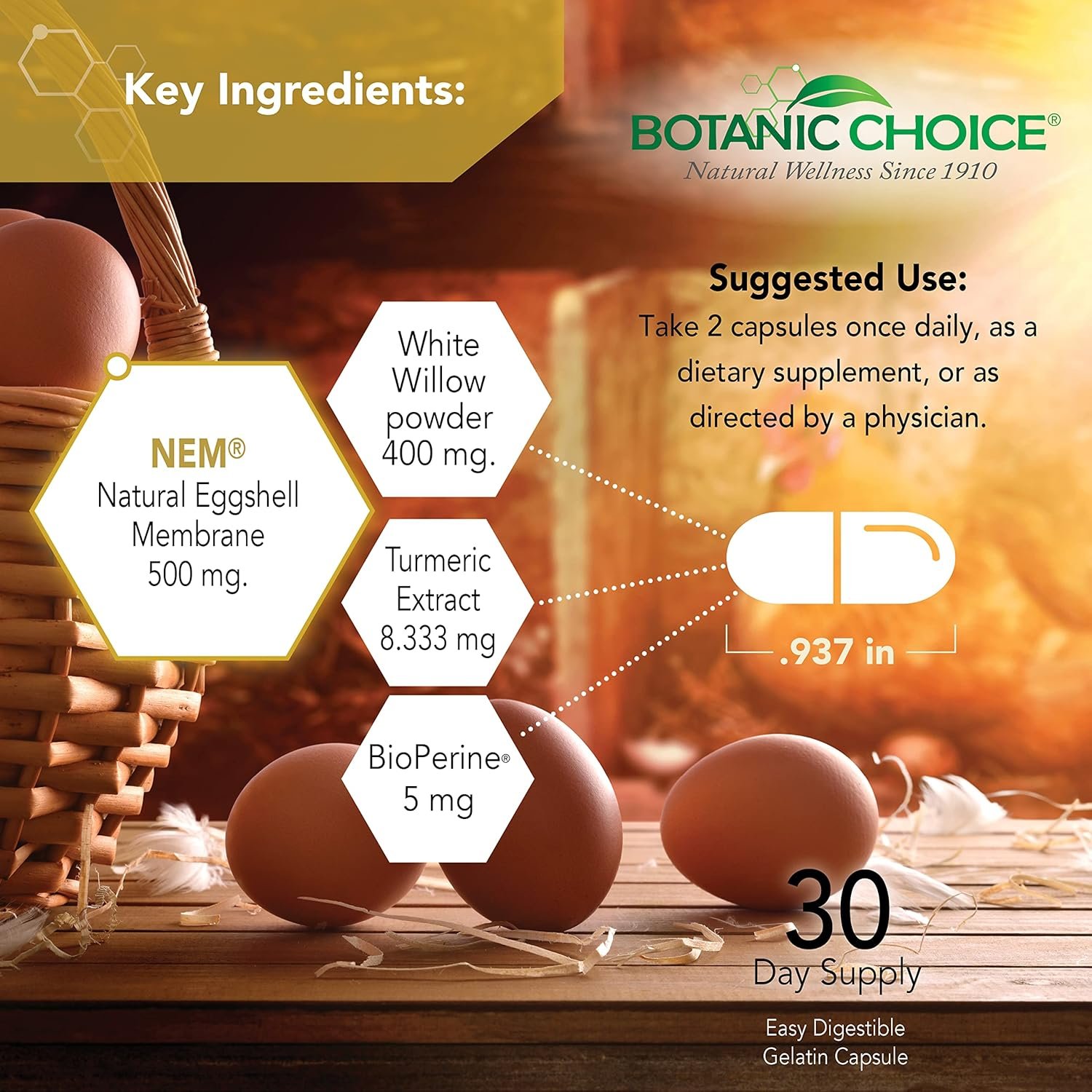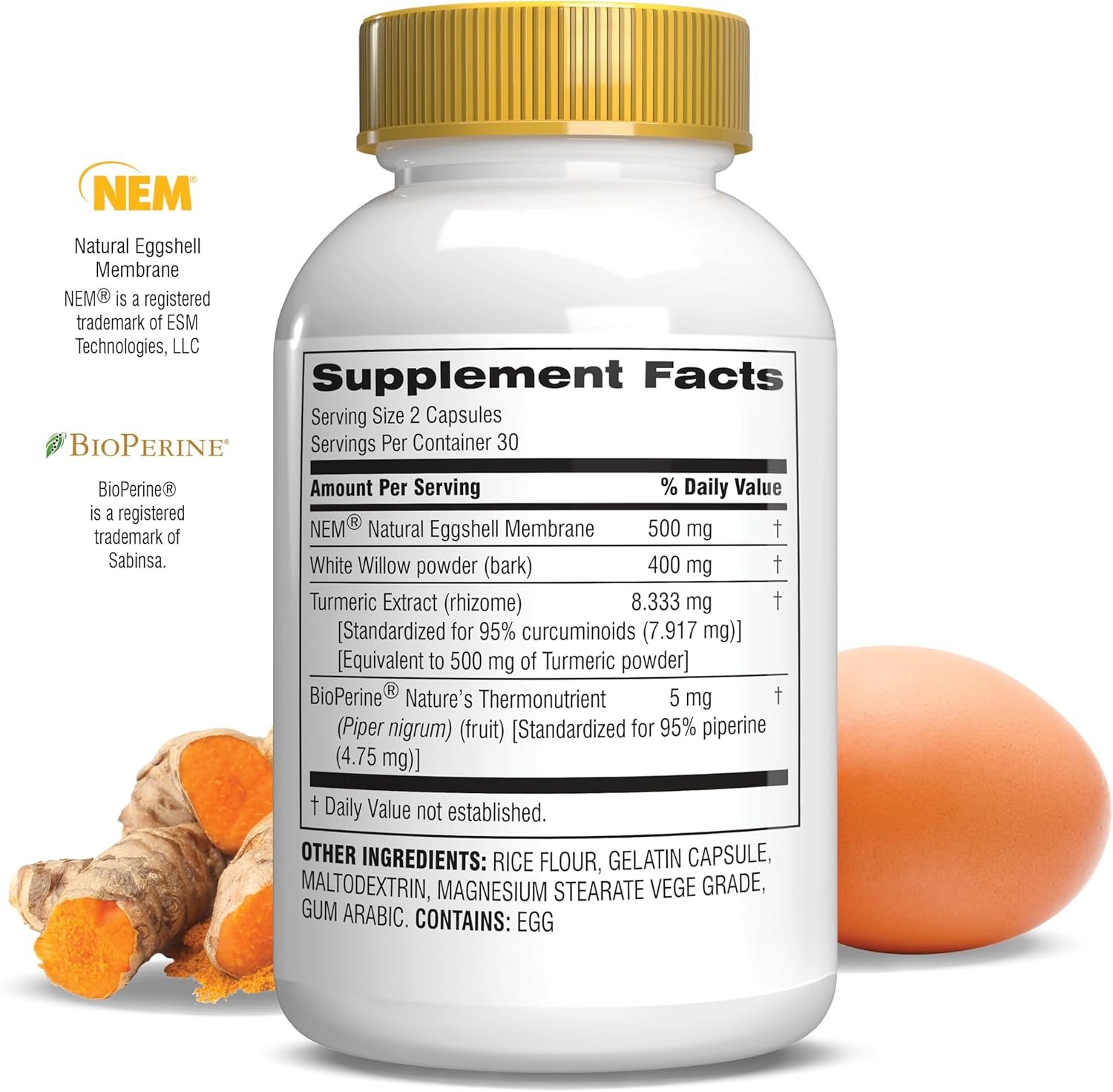 EXPERTLY CRAFTED BLEND- Our formula has clinically studied Natural Eggshell Membrane and highly concentrated Turmeric extract that is selected for its potency. Also importantly added are White Willow bark powder, which contains Salicin and Bioperine black pepper to help aid in absorption of nutrients