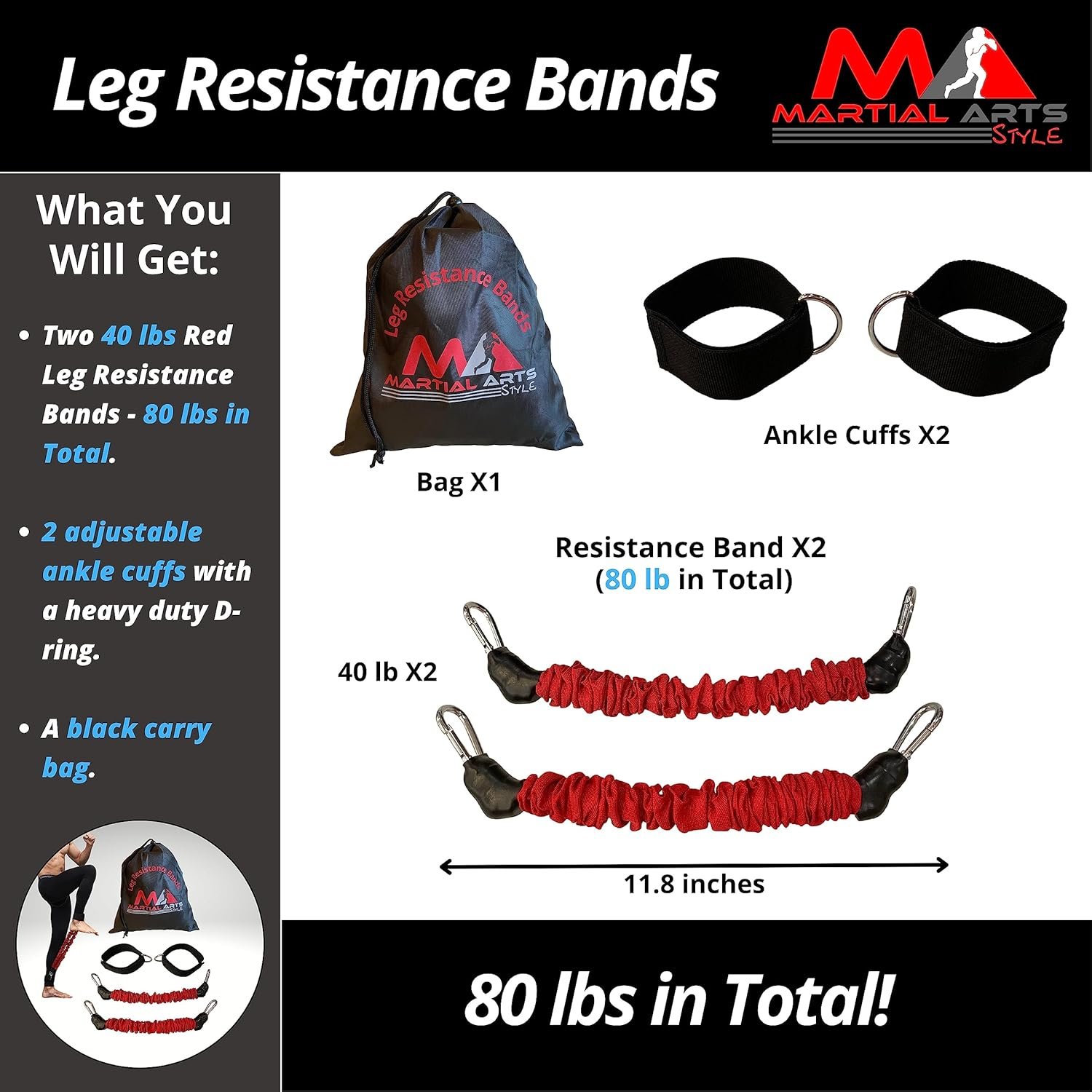 WHAT YOU WILL GET – 2 ankle cuffs, 1 carry bag, 2 resistance bands of 40 lb (11.8 inches) each.