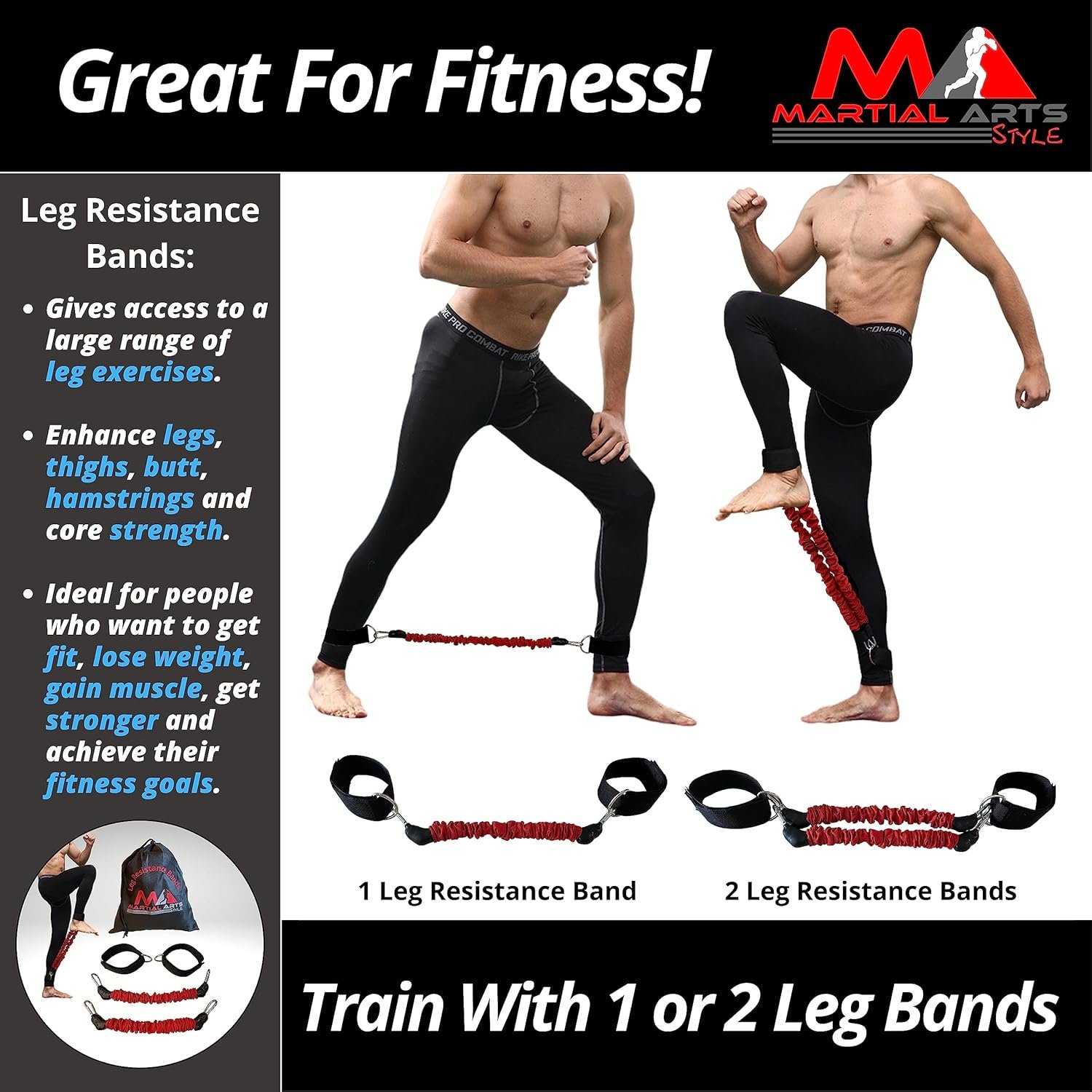 You don’t need to be a professional athlete or practice martial arts to get benefits from training with leg resistance bands because it gives you access to a large range of leg exercises to enhance legs, thighs, butt, hamstrings and core strength. This means it is ideal for people who want to get fit, lose weight, gain muscle, get stronger and achieve their fitness goals.