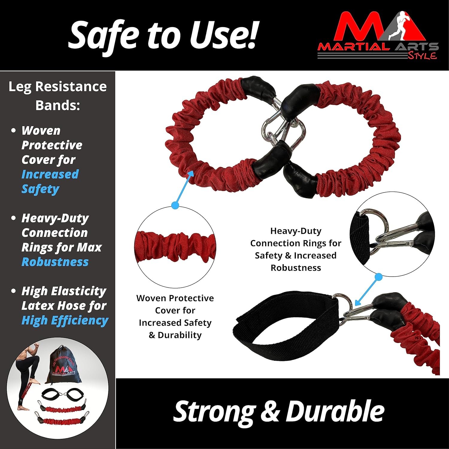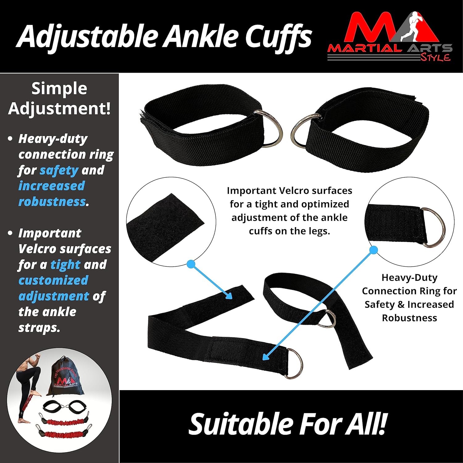 Adjustable Ankle Straps For Customized UseHeavy Duty Connection Rings for Max Safety and Increased RobustnessImportant Velcro Surfaces for a Tight and Optimized Adjustment of the Ankle Cuffs on the Legs