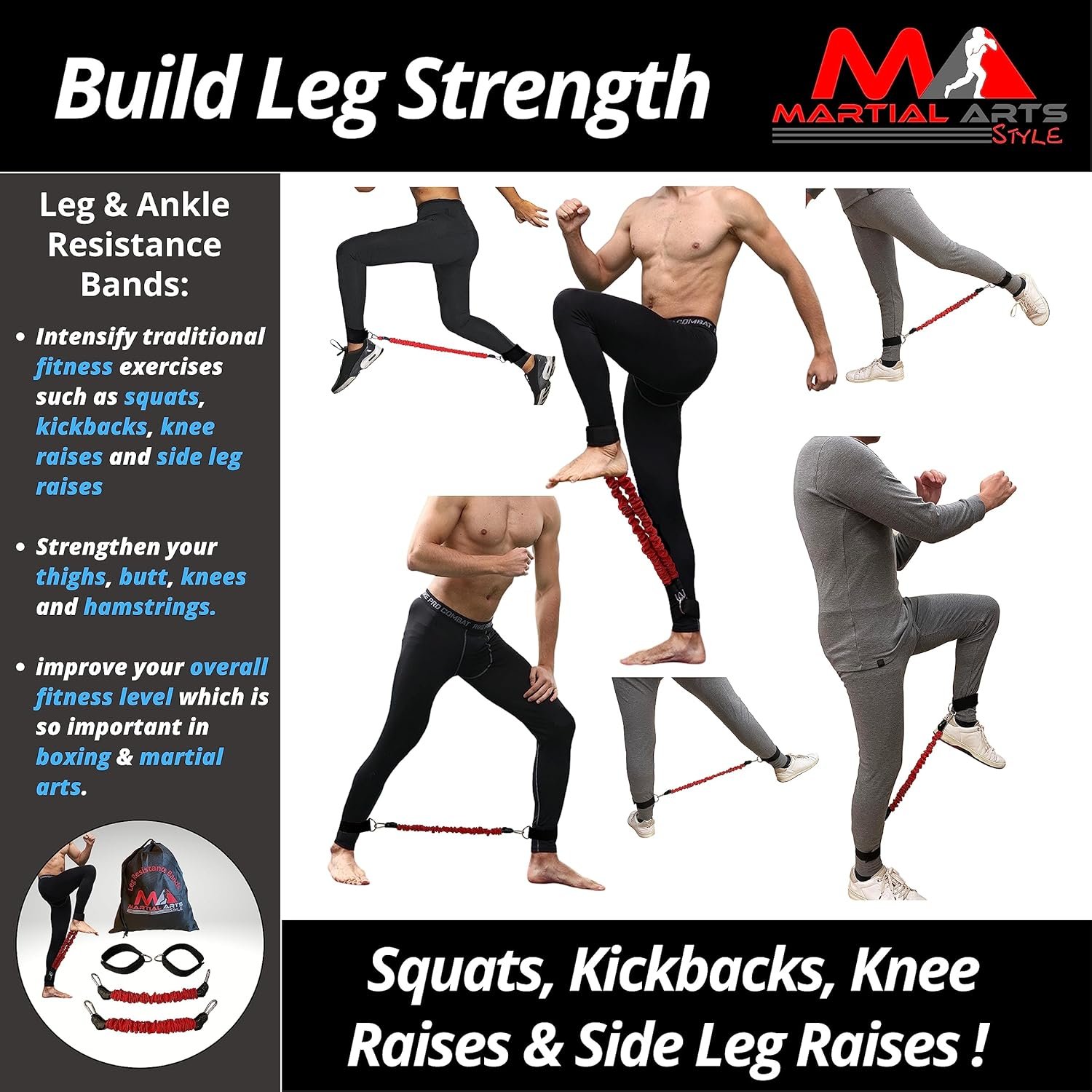 The ankle resistance bands build your leg strength, speed and agility by intensifying traditional fitness exercises such as squats, kickbacks, knee raises and side leg raises. This means these simple exercises will let you strengthen your thighs, butt, knees and hamstrings. The leg resistance bands will contribute to improving your overall fitness level which is so important in boxing and martial arts.