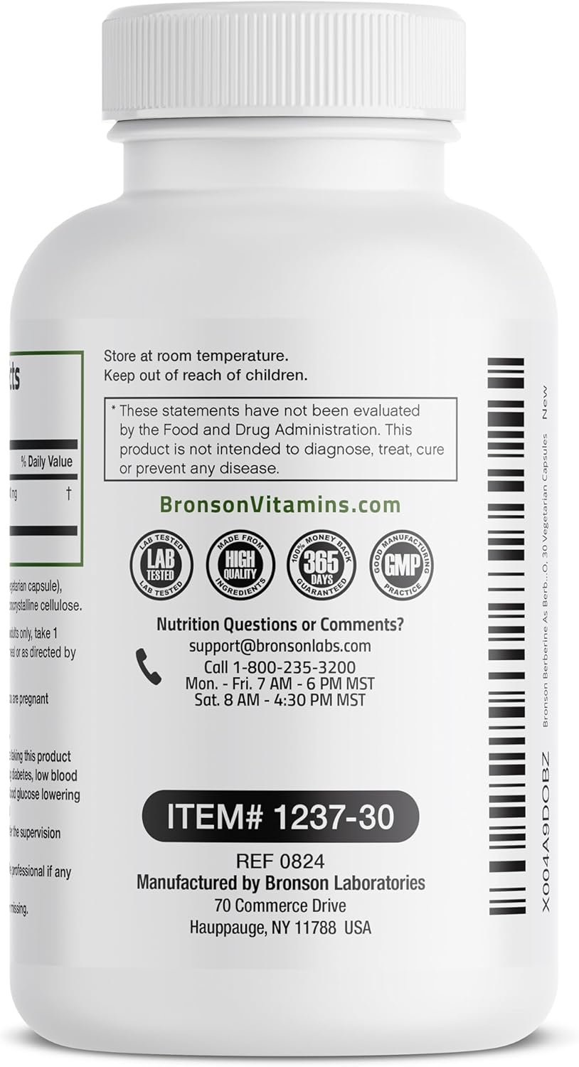 Bronson Berberine HCI is in-house laboratory tested and free of GMOs, Gluten and Soy. Berberine HCI is carefully manufactured by trained professionals in our state-of-the-art facility that is located in Hauppauge, New York.
