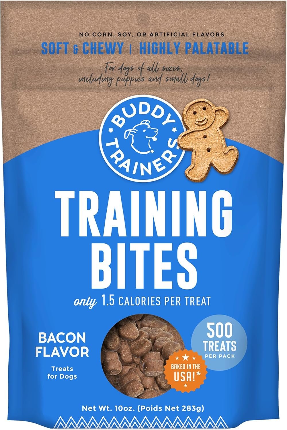 Buddy Trainers Training Bites with natural bacon are the perfect training treat to reward and motivate your dog. There are over 500 treats in every bag and each piece is highly palatable with a pork liver base and only 1.5 calories. Buddy makes training a breeze!