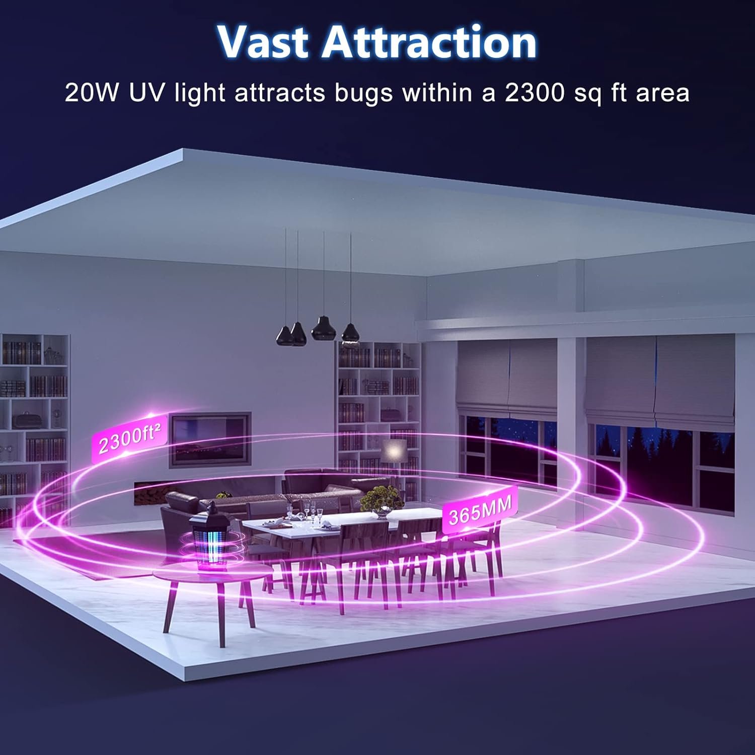 Vast Attraction: 20W UV light and 365mm bug visible violet light can attract bugs within a 2300 sq ft area. Bug zapper outdoor is especially suitable for large spaces, such as garden, balcony, living room, etc.