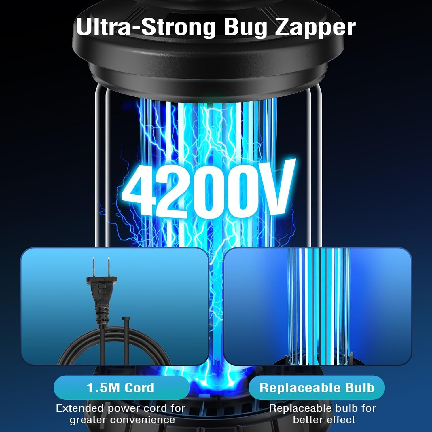 Enhanced 4200V Version: Our latest bug zapper is equipped with a unique light that attracts a broad spectrum of flying insects such as mosquitoes, Aedes, gnats, horse flies, fruit flies, and other pests. Upon being drawn to the light, these insects are swiftly and efficiently eliminated by our environmentally friendly gnat killer. This portable mosquito zapper offers the ultimate solution to your insect issues, suitable for both home and outdoor use