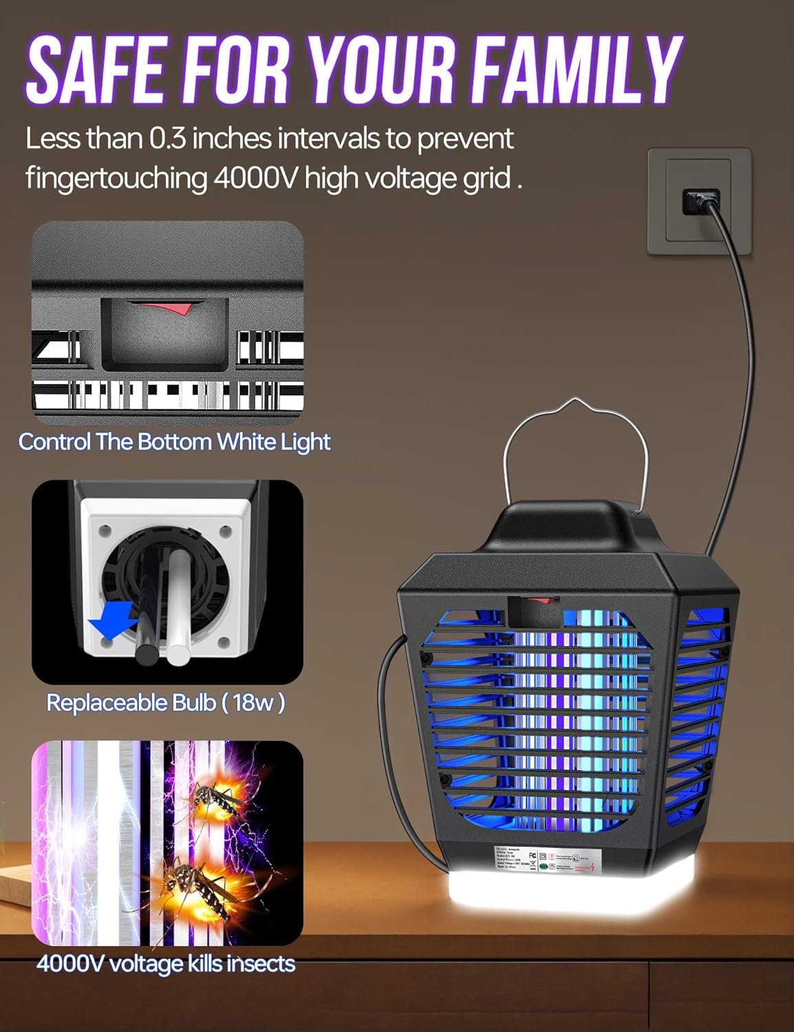【Effective Physical Mosquito Killer】The two-color light can attracts most flying insects: mosquito,Aedes, gnats, midges,flies,horse flies,fruit flies,house flies,moths,wasps,etc.The voltage of the electrical grid is up to 4200v.Once the insects fly in,this bug zapper will physically killing them in an efficient and environmentally friendly way.This bug zapper is EPA registered,safe for your family and pet.