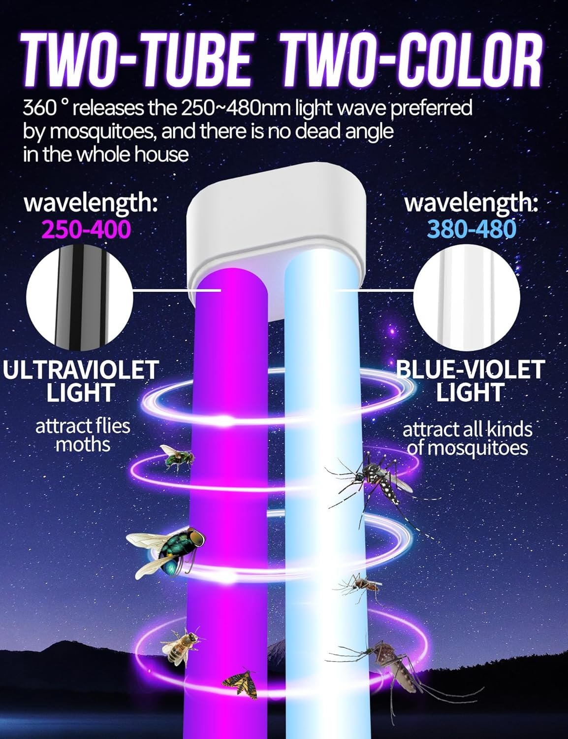 【Two-Color】The white tube emit blue-violet light which can effectively attract all kinds of mosquitoes.The ultraviolet light emitted by the black tube is effective in attracting flies,moths and other insects