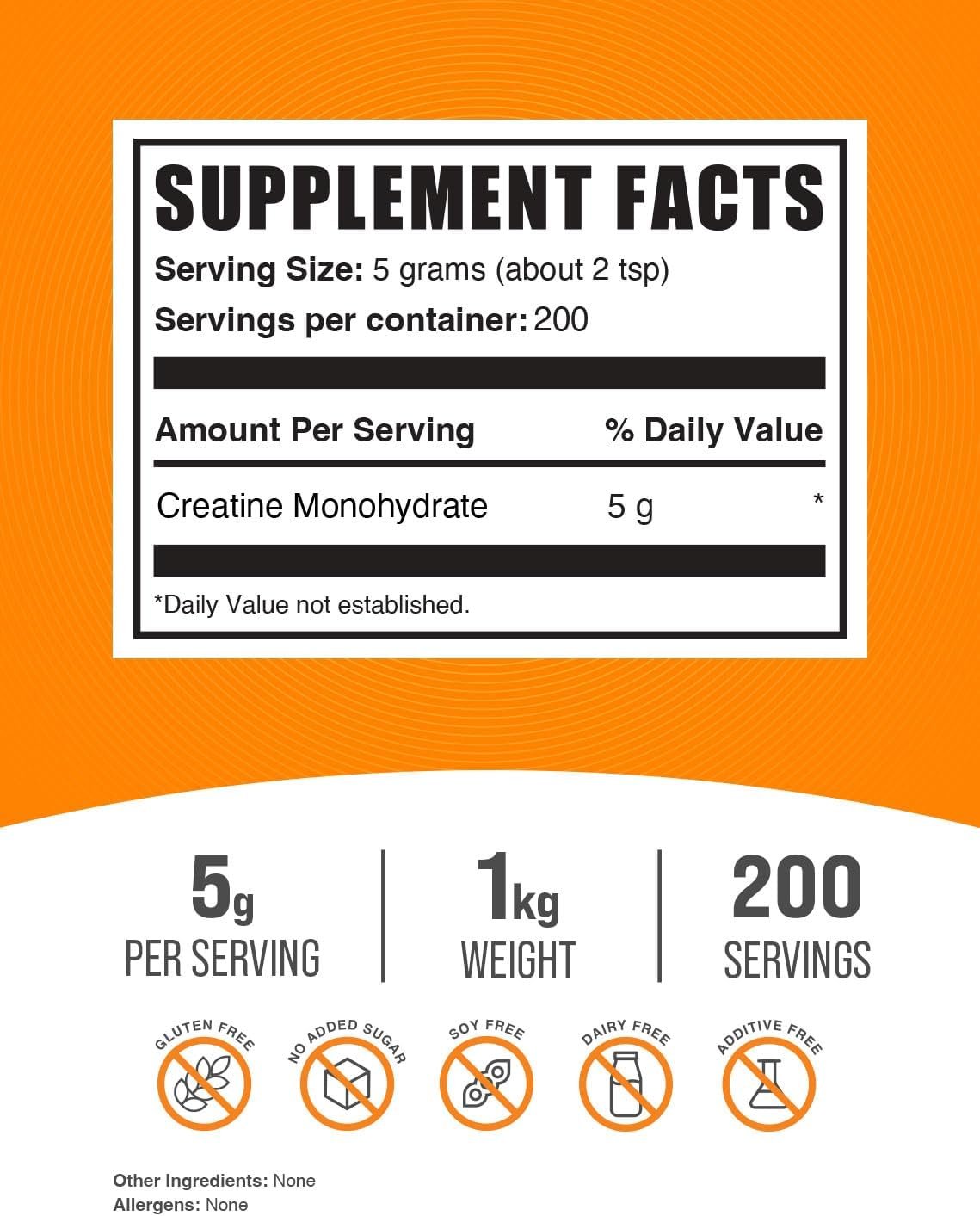 BulkSupplements.com Creatine Monohydrate Powder – Creatine Supplement, Micronized Creatine 1kg, Creatine Powder – Unflavored & Gluten Free, 5g (5000mg) per Servings, 1kg (2.2 lbs) (Pack of 1)