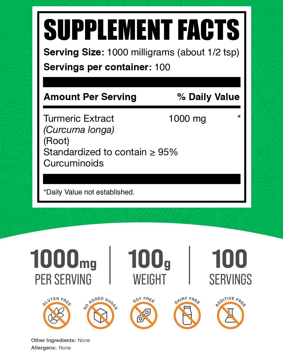 BulkSupplements.com Turmeric Extract Powder – from Turmeric Root, Curcumin Supplements 1000mg, Turmeric Curcumin Powder – Gluten Free, 1000mg per Serving, 100g (3.5 oz) (Pack of 1)
