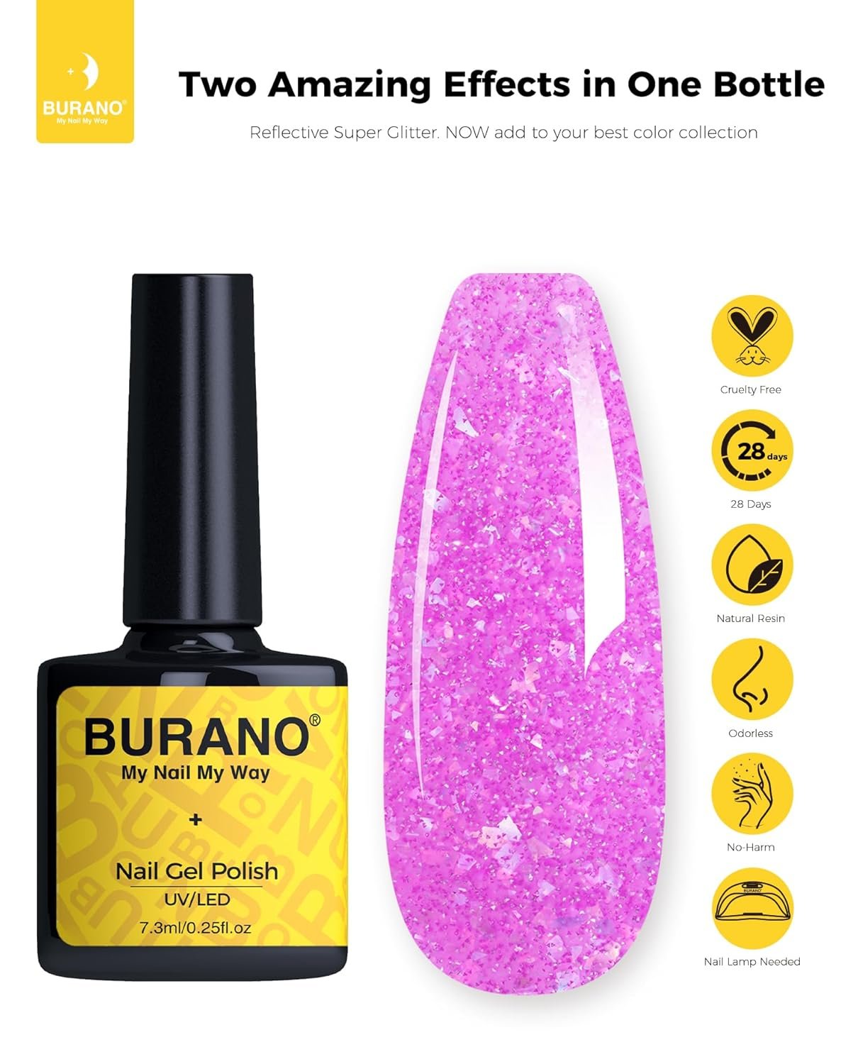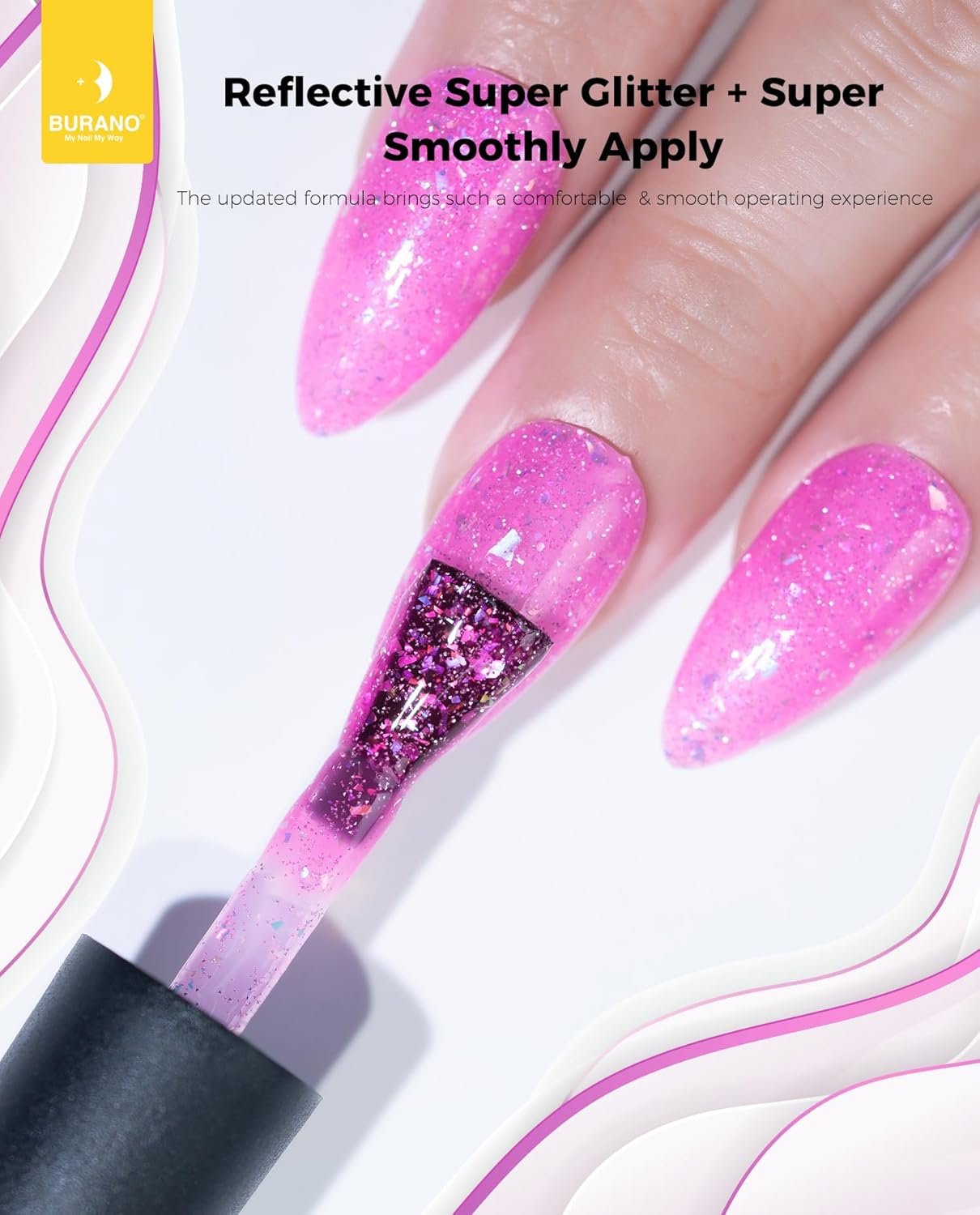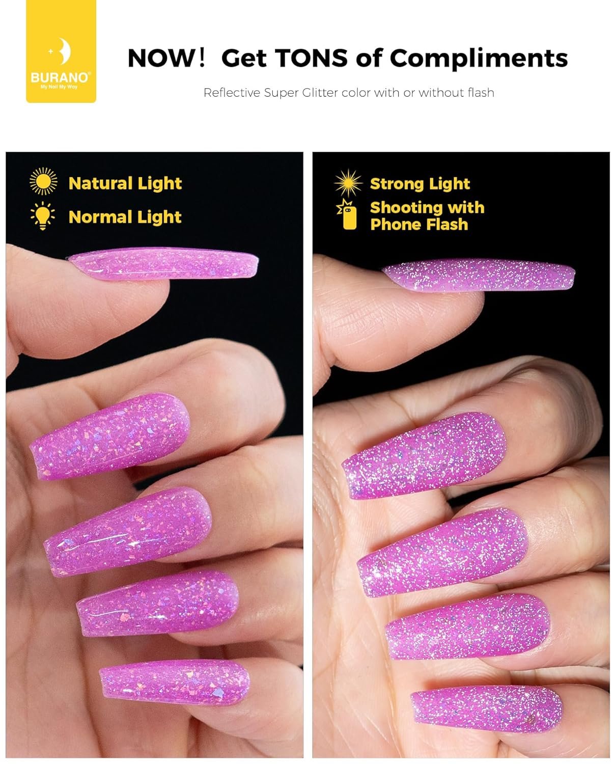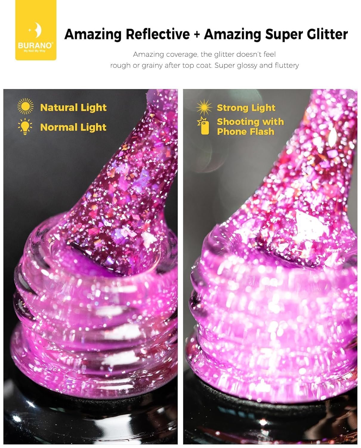 Upgraded Version Sparkle Gel Nail Polish: We have updated our gel nail polish, makes them more shining and smoother. You’ll love it once you use it. BURANO glitter gel polish reflective sparkling nail polish is the best shining gel you haven’t ever used before
