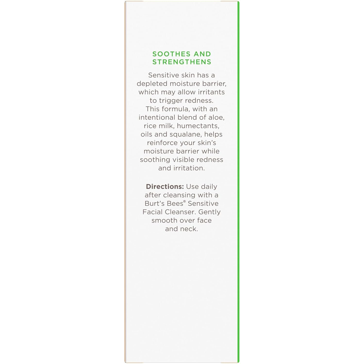 BURT’S BEES SYNERGISTIC BLEND OF ALOE, RICE MILK AND HONEY: Clinically shown to calm and soothe sensitive skin, reducing visible signs of redness and helping to restore the skin’s moisture barrier