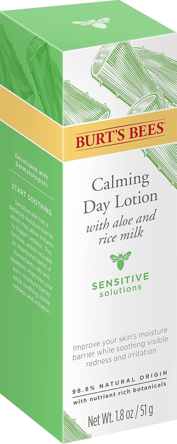 Take extra care of sensitive skin with Burts Bees Calming Day Face Lotion With Aloe and Rice Milk. This sensitive skin face moisturizer contains a soothing blend of aloe and rice milk extract to deliver intense everyday hydration without harsh irritants. The addition of cotton extract in this moisturizer face cream helps to replenish the skins outer layer and minimize the effects of potential irritants, such as harsh soaps and cleansers. The 98.9% natural origin face lotion for sensitive skin is formulated without parabens, phthalates, petrolatum or SLS, made with ingredients from nature and Leaping Bunny Certified (never tested on animals). Simply smooth the hydrating lotion over face and neck daily after cleansing. Pair the sensitive skin lotion with other Burts Bees facial skin care products, including facial cleansers, facial toners and facial masks. Burts Bees is the No. 1 dermatologist-recommended natural skin care brand (1). (1) Based on a September 2021 NielsenIQ national survey of U.S. Dermatologists