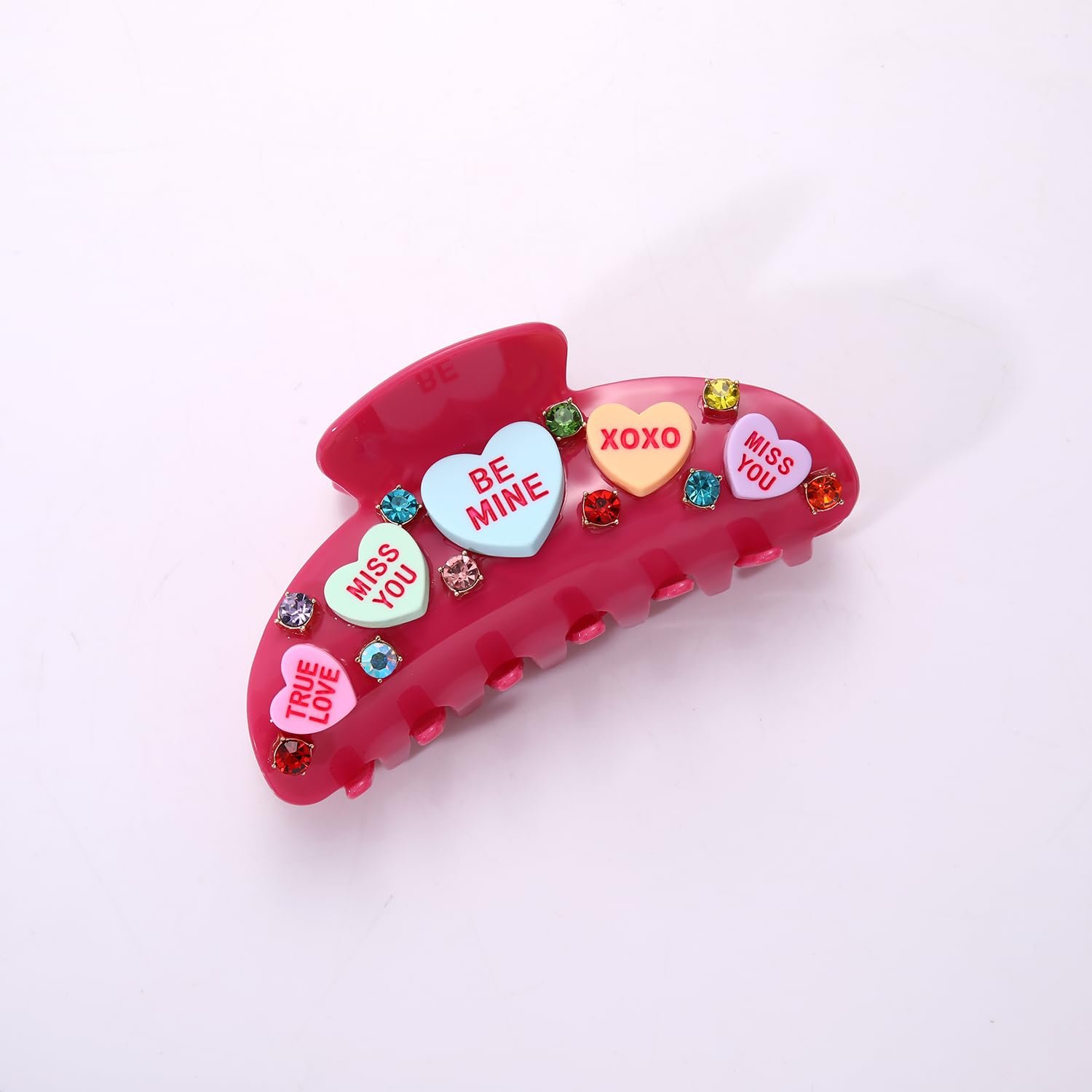 Charming Design: Our Valentines Hair Claw Clip for Women features a classic large oval shape in a delightful hot pink hue, beautifully embellished with sparkling crystals and colorful candy hearts. Each crystal hair clip showcases romantic messages like “BE MINE,” “HUG ME,” and “MISS YOU,” making it the perfect hair accessory to celebrate love during Valentine’s Day.