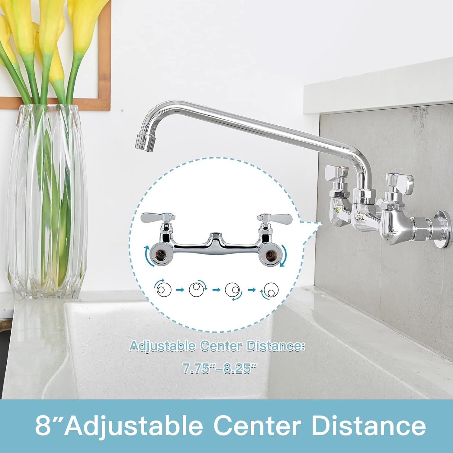 Flexible Usage: Two lever handle with hot and cold signsis designed for ease of use for water flow and temperature adjustment, commercial sink faucet and handle operates with a 90° forward rotation, no backsplash clearance needed, save space commercial sink faucet 8 inch center, kitchen sink faucet.
