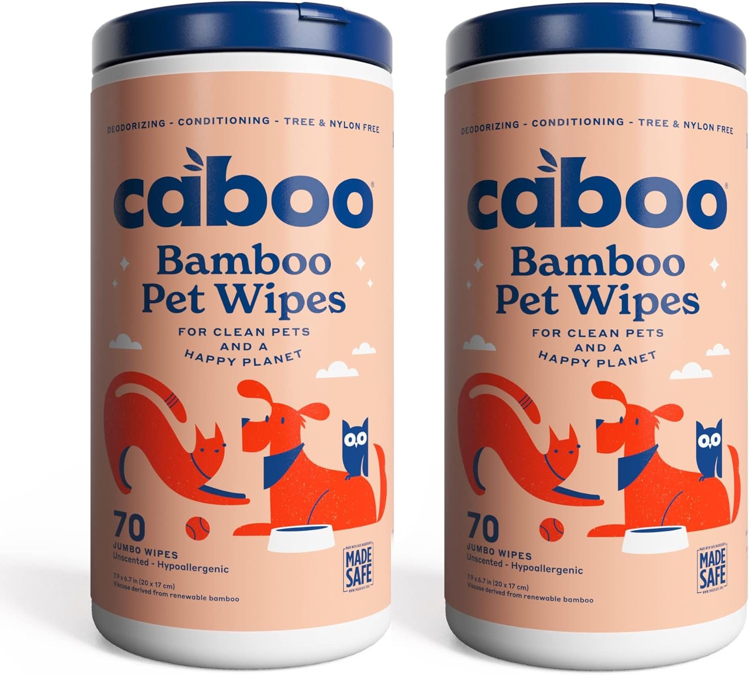 Caboo Tree Free Pet Wipes for Dogs & Cats | Natural, Earth Friendly, Deodorizing, Hypoallergenic Cleaning Wipes for Eyes, Ears, Paws, & Face (Unscented, 2 Canisters, Total of 140 Jumbo Wipes)