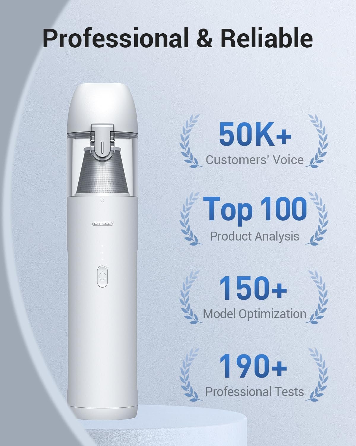 [Convenient Cleaning Companion] Do you appreciate the freedom to clean without being tethered to a power outlet or struggling with tangled cords? This CAFELE mini handheld vacuum allows us to effortlessly reach tight corners, furniture crevices, and even our car interiors. For its compact size, it does a good job of picking up any small messes, which makes cleaning easier and happier.