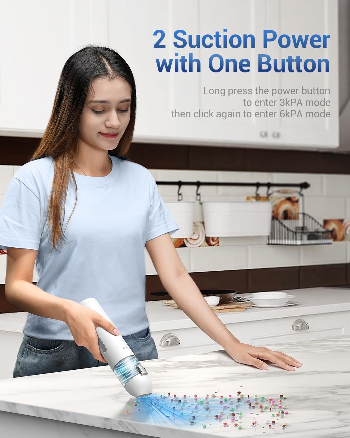 Equipped with 2023 upgraded 3.Gen. 65W powerful motor, this remarkable cordless mini vacuum cleaner also features a cutting-edge dual suction design, offering two distinct modes with 3000Pa and 6000Pa. Long press the power button for 1.5 seconds to enter the [low suction mode], and short press to enter the [high suction] mode. From crumbs to pet hair, this handheld car vacuum can handle it all with ease. Whether you’re dealing with everyday dirt or more stubborn messes, simply switch between these modes for a customized and efficient cleaning experience.