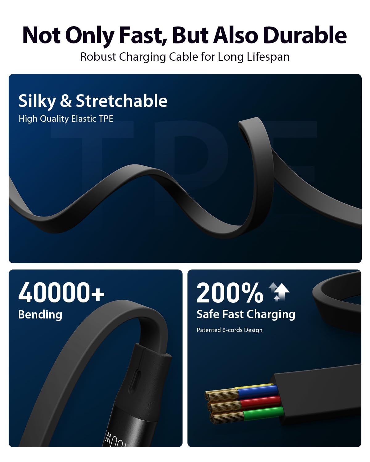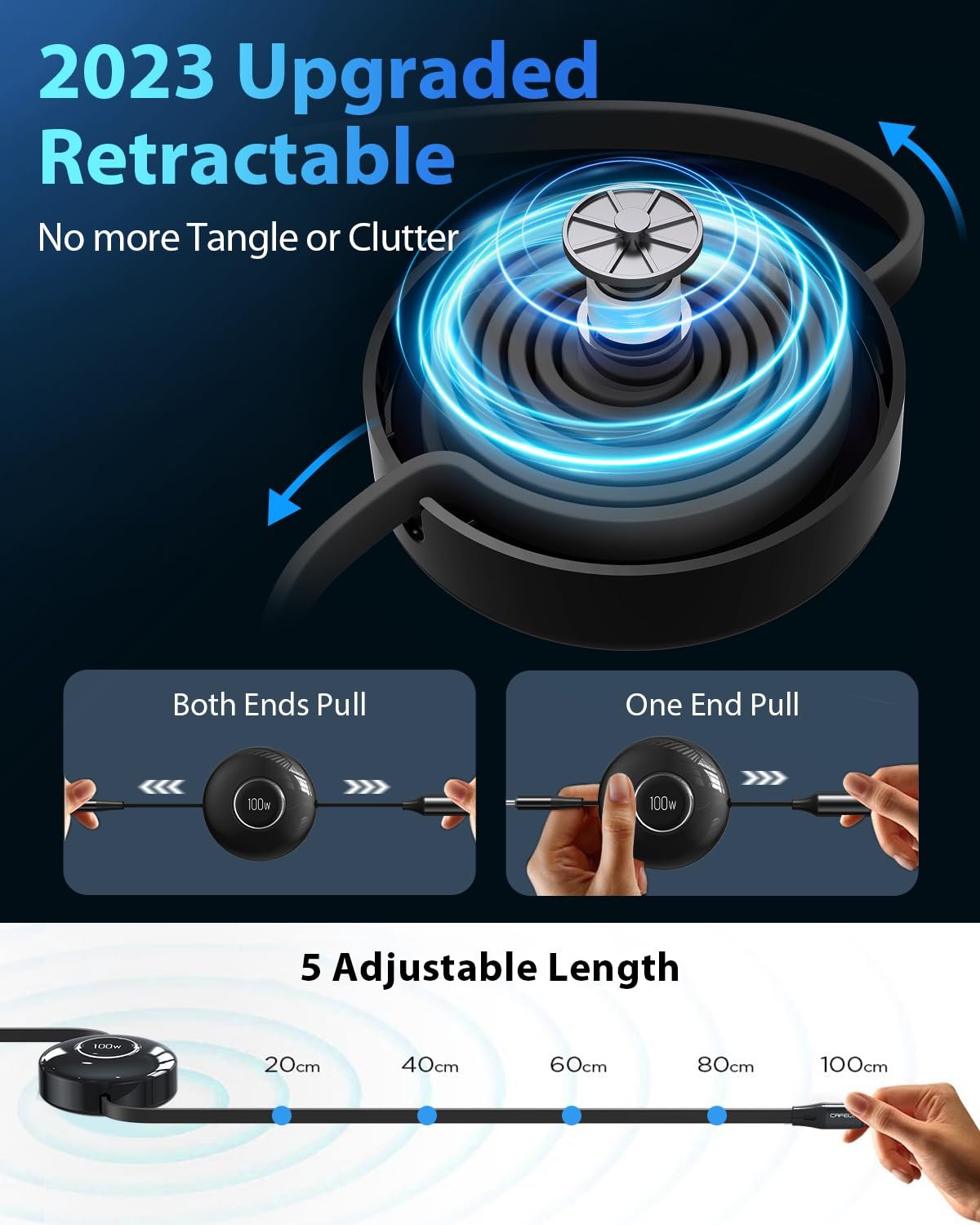 Portable & Retractable: This retractable phone charger offers 5 adjustments: 0.6ft-1.6ft-2.3ft-3ft-4ft, providing flexibility without the bulk. Perfect for travel, business trips, Uber Lyft business, or office. The upgraded 2024 version supports both ends pull and one end pull, and ensures a tangle-free and organized experience.
