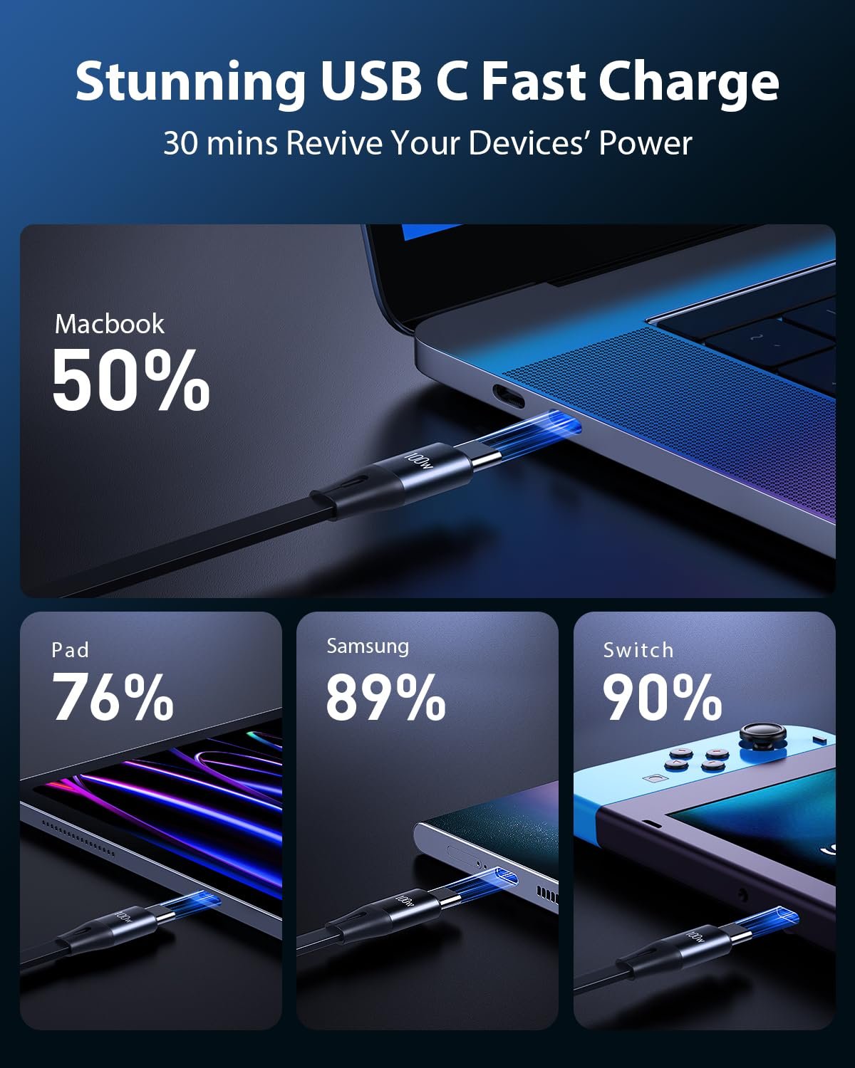 100W Multi Charging Cable for Travel: This USB-C to USB-C cable offers blazing-fast charging up to 100W, powering devices like the MBook Pro 14″ to 55% and the S22 Ultra to 80% in just 30 minutes. It’s versatile and robust, making it the reliable travel companion for those who need efficient charging across multiple devices like phones, laptops, and tablets.