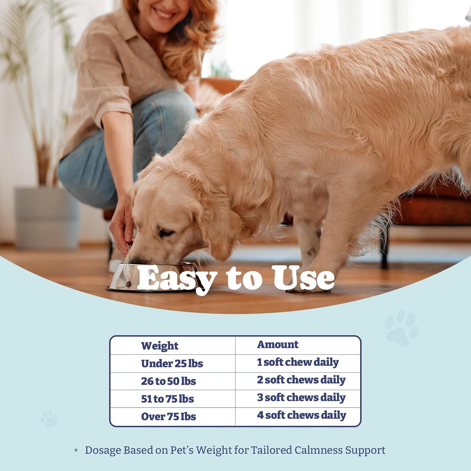 EASY TO USE: Dog calming chews are easy to use and can be given to dogs as a daily treat or as needed. They are suitable for dogs of all ages and sizes and can be used with other calming supplements or medications.