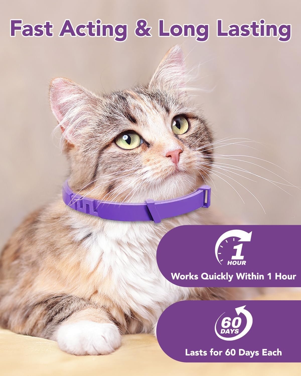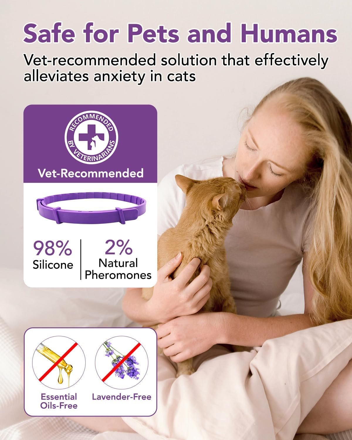 Safe & Effective – Free from lavender, essential oils, and harmful chemicals, our cat calming collar contains only 2% natural pheromones, a safe and effective solution for alleviating anxiety in cats, recommended by veterinarians for stress-related behaviors. Our calming cat collar is designed to provide effective relief while ensuring complete safety for your furry family member.