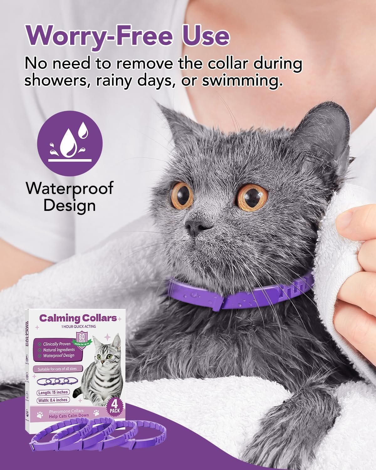 240 Days of Continuous Calming – 4-Pack value, each cat collar provides up to 60 days of continuous pheromone release, ensuring long-lasting calming effects. For best results, the collar can be worn around the clock. No need to remove the calming collar during showers or rainy weather – it’s waterproof and continues to release calming pheromones, even in damp conditions.