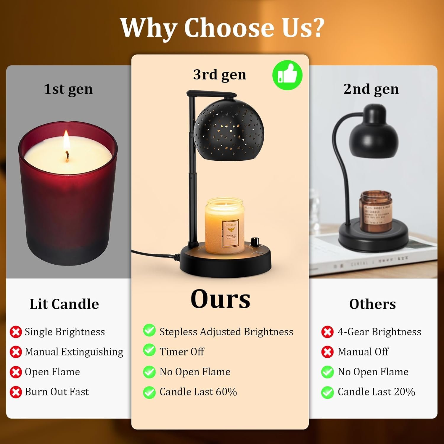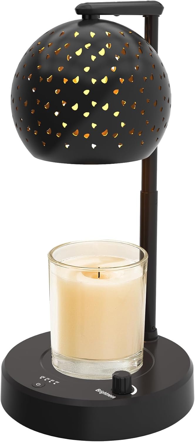 [Height Adjustment & Fit All Size Candles] This amazing candle lamp warmer can accommodate all size candles. The extension pole height can be adjust from 5.63-12.2 inch to fit candles that are less than 8 inches height. Additional, you can control the candle melts speed by adjusting the height of the lamp. The stronger the brightness, the faster the candle melts, the stronger fragrance. The candle more closer to lamp, more heat it generates then wax candle melt faster.