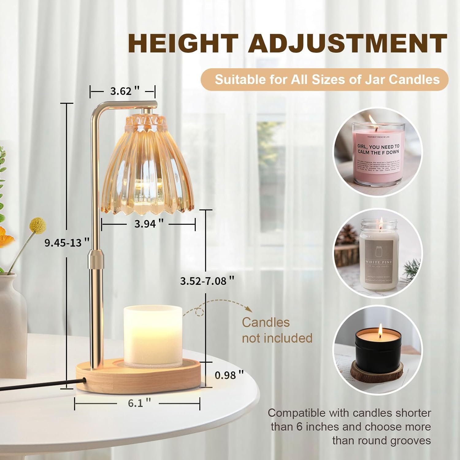 Our candle warmer holder features an upgraded design with adjustable height from 3.5 to 7.1 inches. Suitable for candles of all types and sizes.