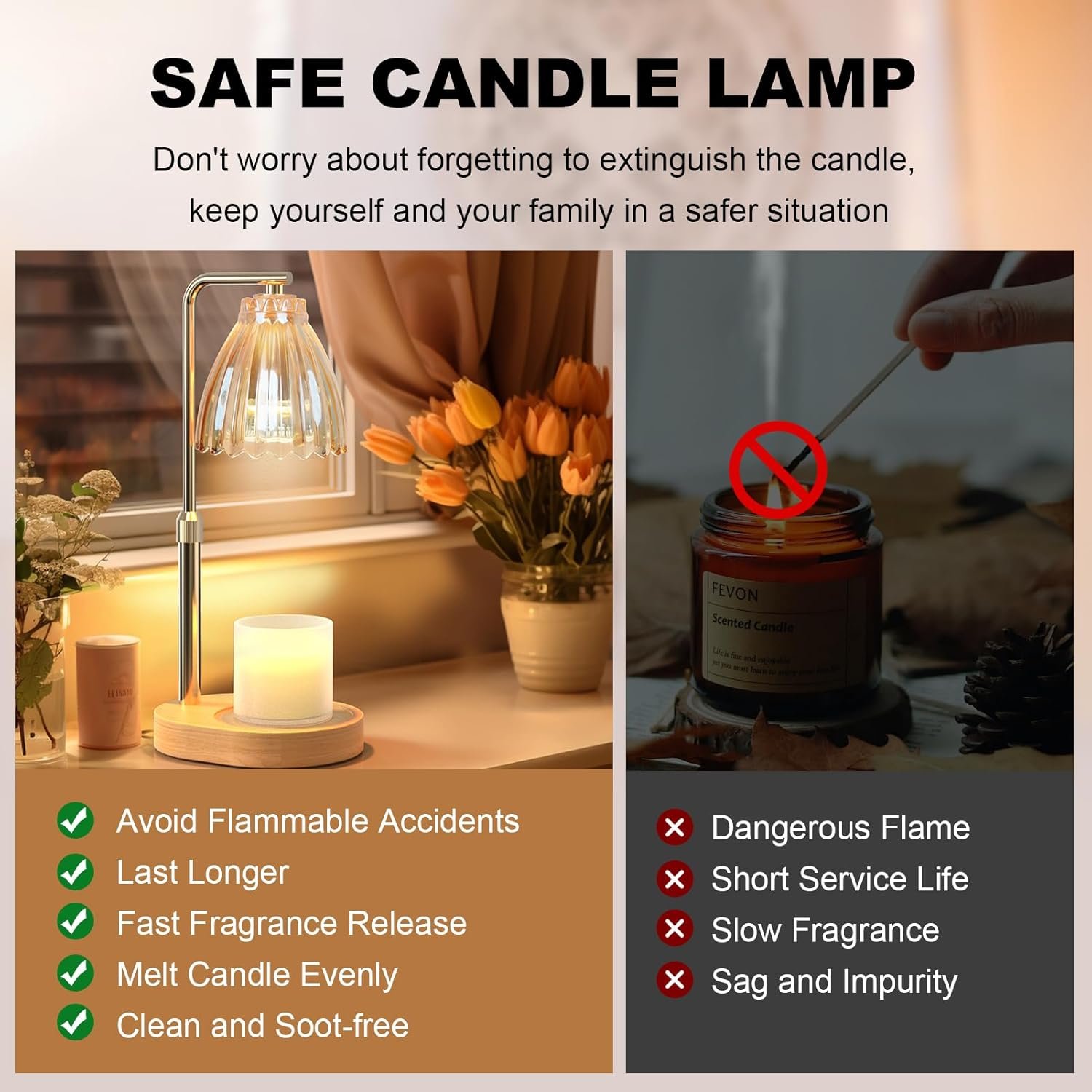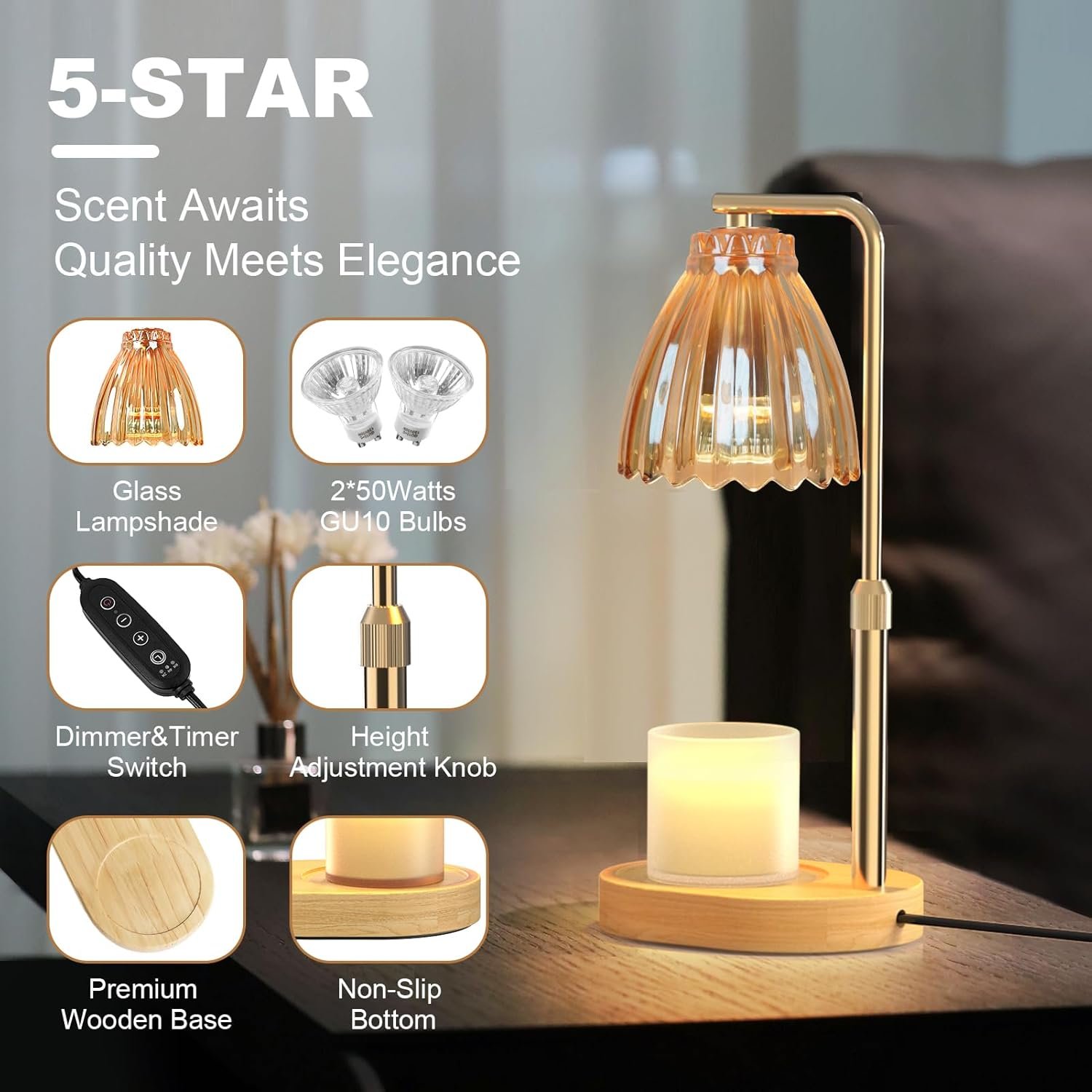 Adjustable Height and Fits All Candle Size: Featuring an upgraded design, our candle warming lamp holder allows for adjustable height ranging from 3.5 to 7.1 inches. With grooves on the wooden base, it can accommodate candles of various sizes, ensuring optimal visual effect and user experience. We have also added anti-slip pads to ensure stability, providing you with a sense of security while using this candle warmer lamp.