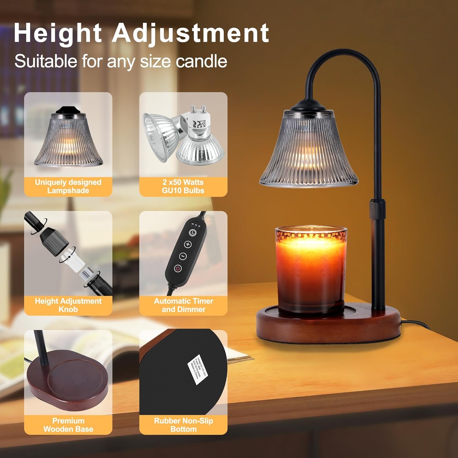 FIT ALL CANDLE SIZES: This candle warmer lamp with timer has a 6.1 inch wooden base to make it stable. The height adjustment switch can adjust the lampshade from 11.2 inches to 13.3 inches high, so no more worry about fragrance size