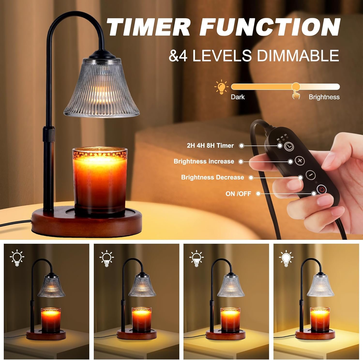 MULTI-FUNCTION: The candle warmer lamp can control the evaporation speed of the candle by adjusting the brightness of the light, thereby controlling the aroma concentration of the scented candle, 3 timed length options(2H/4H/8H) to suit your usage or sleeping habits