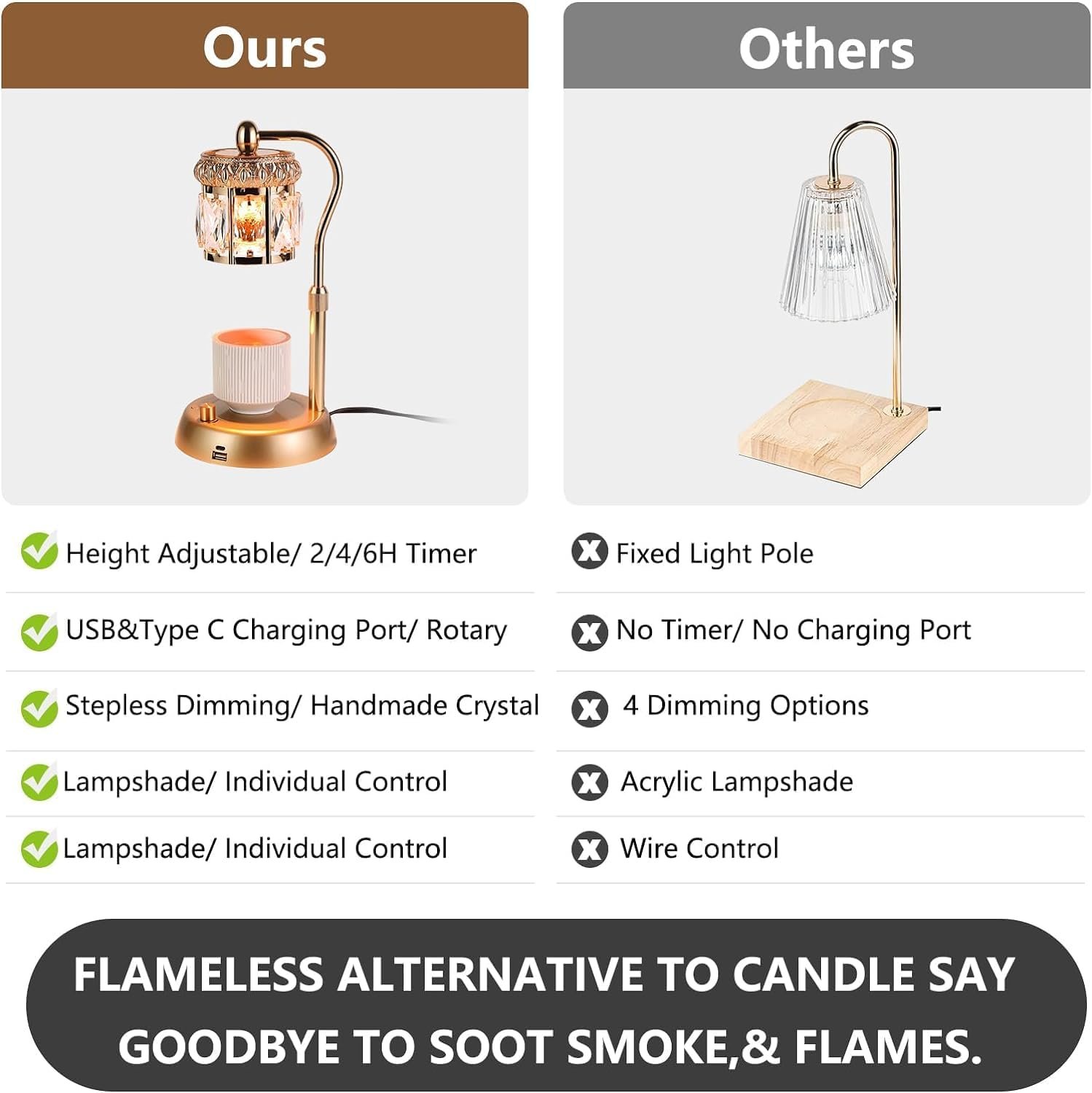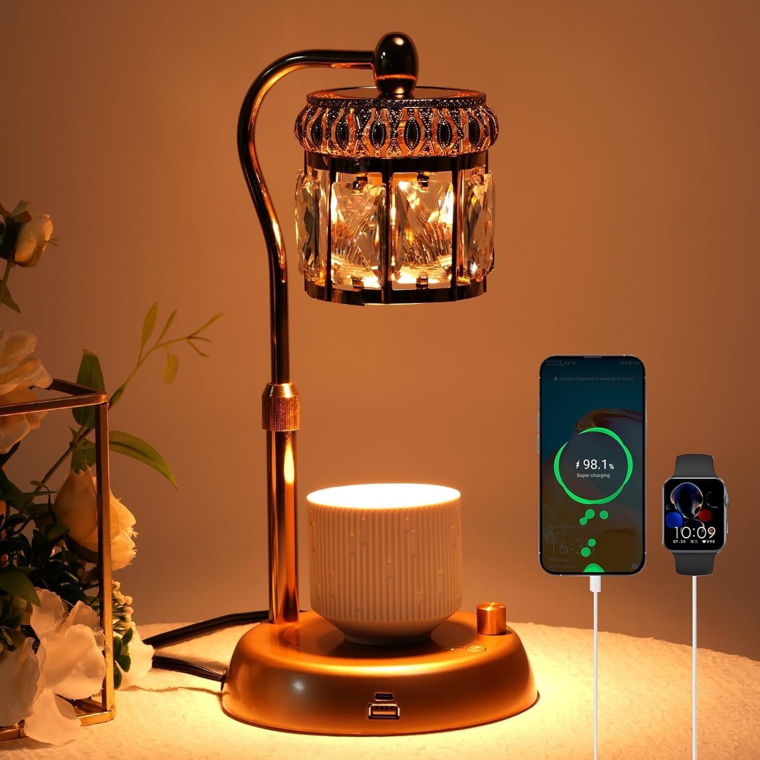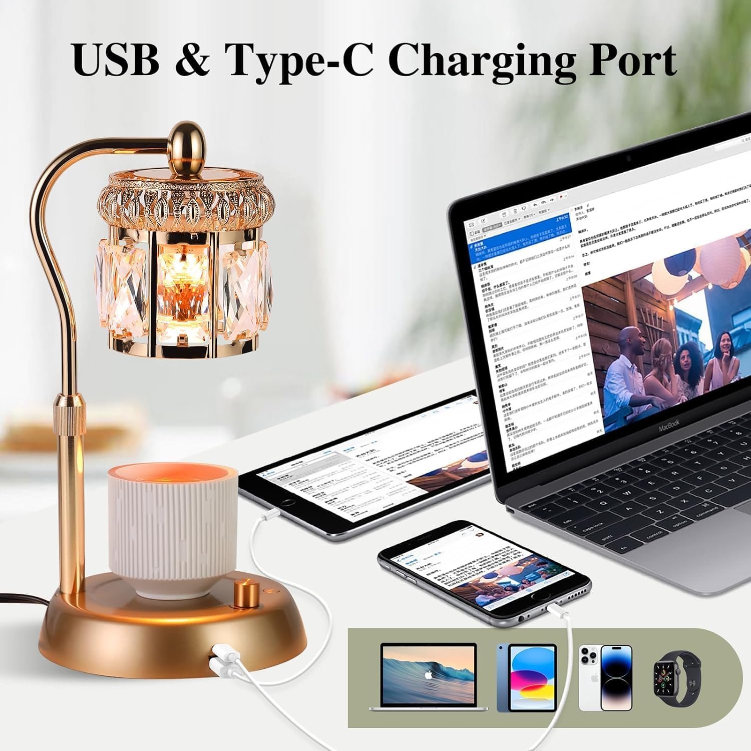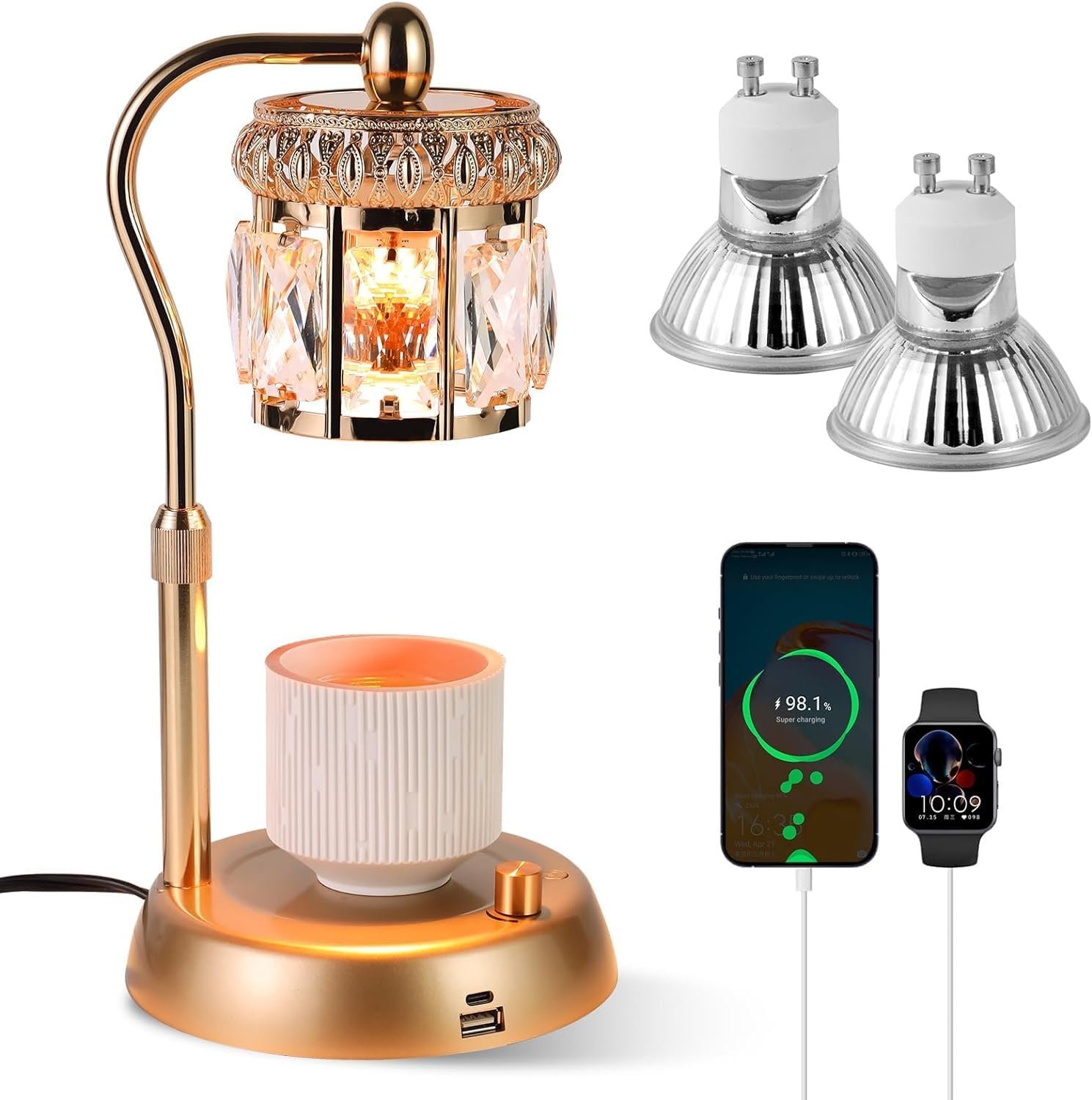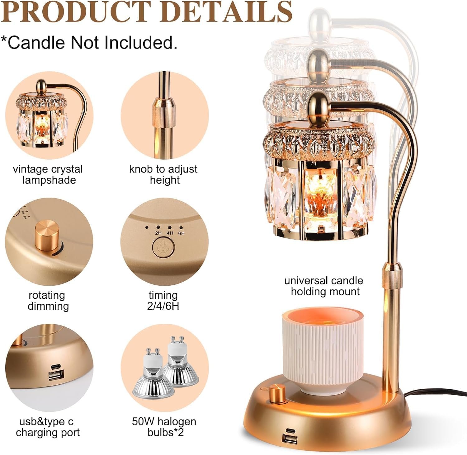 Candle Warmer Lamp with Timer, Dimmable, USB & Type-C Output Candle Warming Lamps Height Adjustable for All Size Scented Candles, Electric Wax Melt Warmers, 2 Bulbs Included (Crown Crystal, Gold)