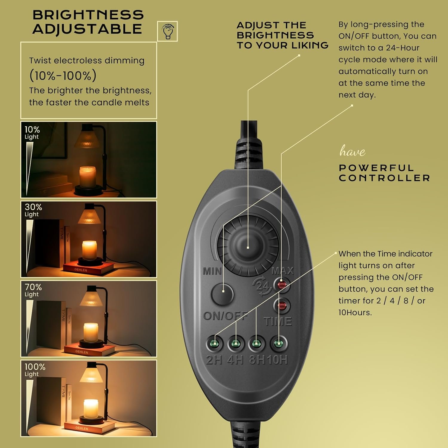 Timer and Dimmer: This wax melt warmer comes with dimmer timer switch, you can control the melting speed of the candle by adjusting the brightness of the lamp. The lamp also has 2h, 4h, 8h, 10h timer functions, and can be cycled in 24 hours, allowing you to fall asleep just right and turn off on time.