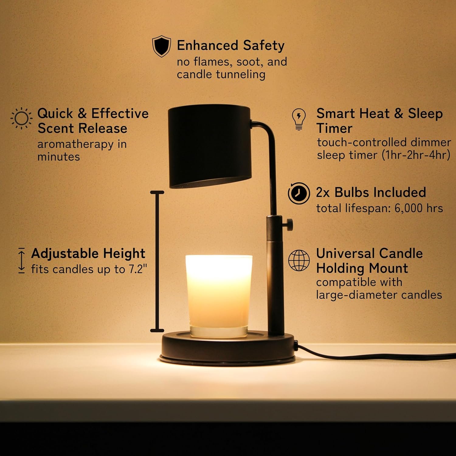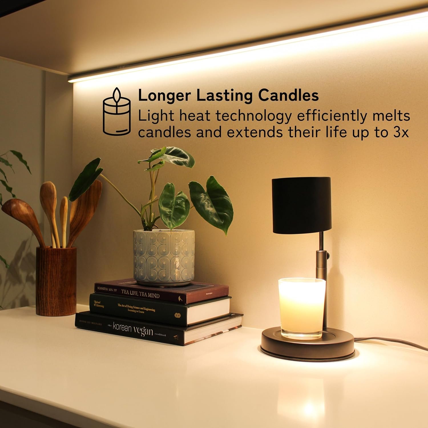 π CUSTOMIZABLE! Enjoy candles hassle-free – Place the candle under the light, adjust the brightness using the dimmer dial for the desired melt speed, and use the smart sleep timer’s 1hr-2hr-4hr functions for its automatic turn-off feature!