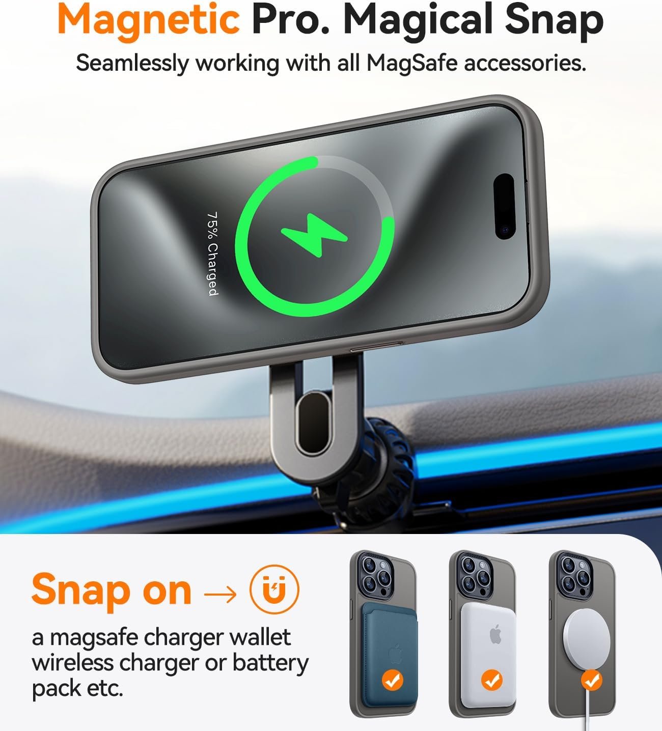 Powerful Magnetic Attraction: compatible with MagSafe and Qi wireless chargers. It securely connects to magnetic accessories like wallets, power banks, and car mounts for a stable connection during rotation or movement