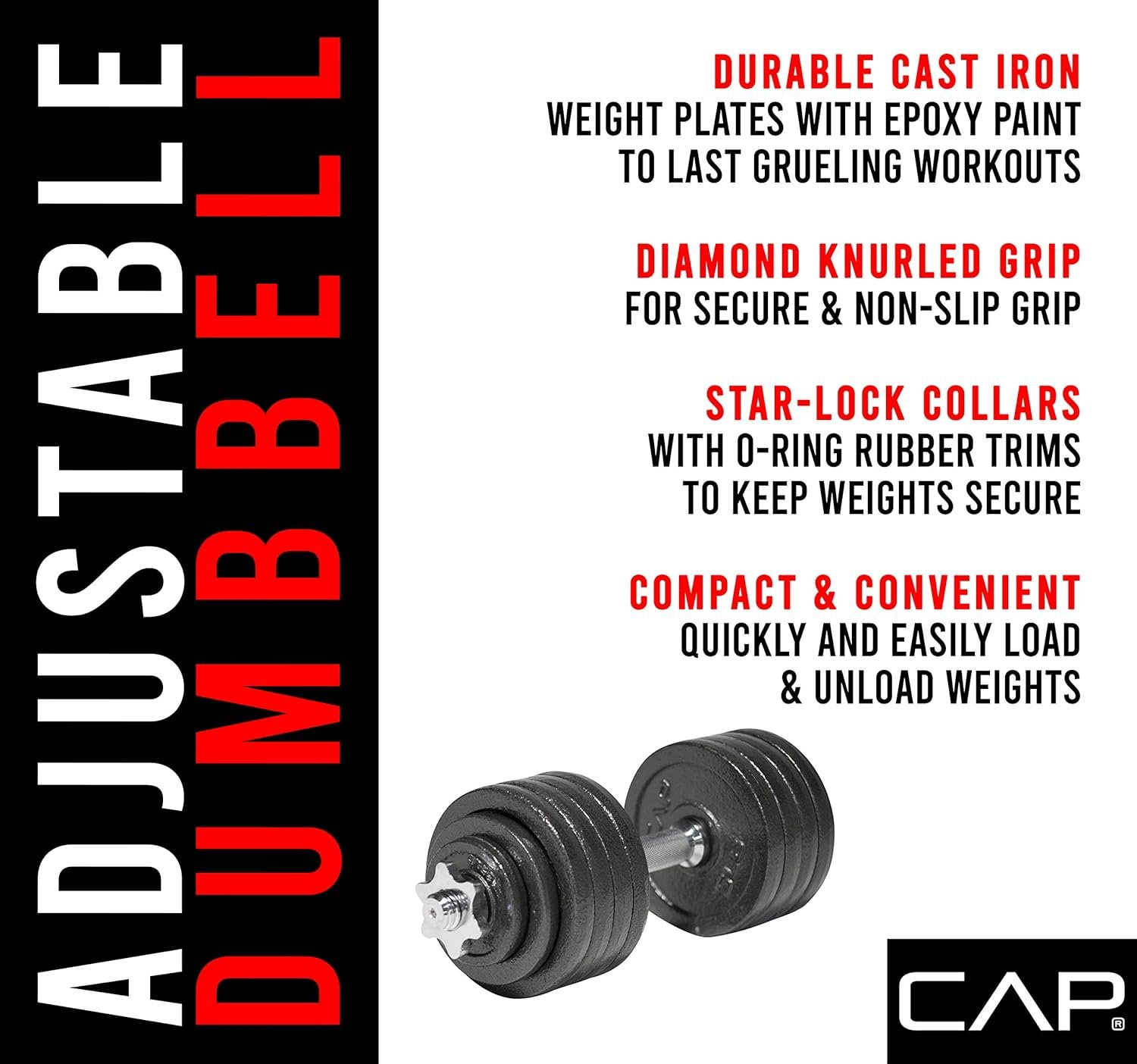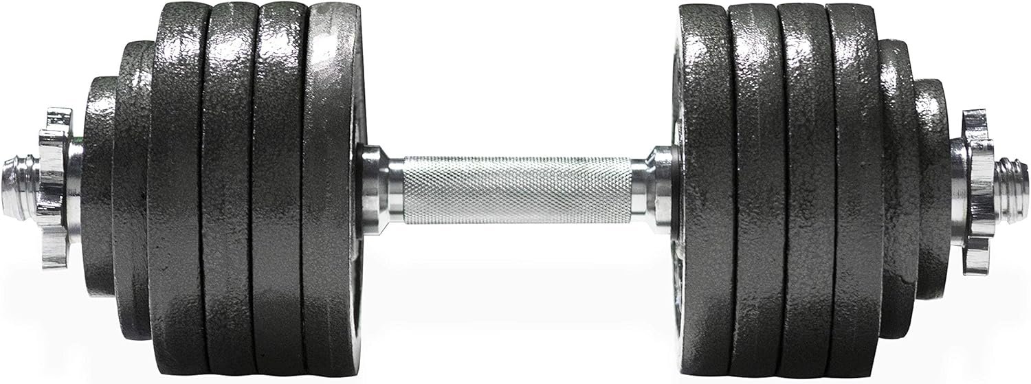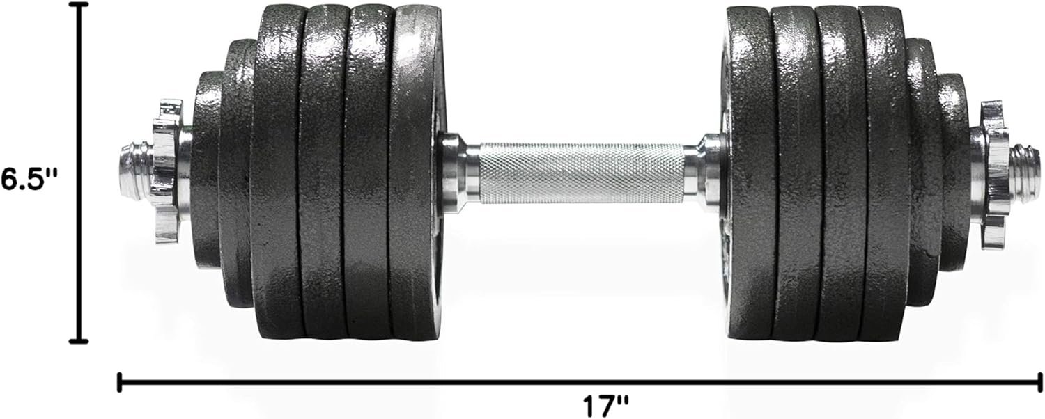 Set includes – 52. 5 lbs. Total: one 17” dumbbell handle, two 1. 25-Pound plates, two 2. 5-Pound plates, eight 5-pound plates, and two star-lock collars.
