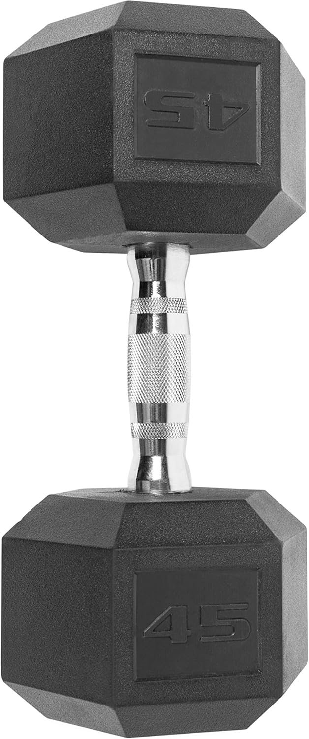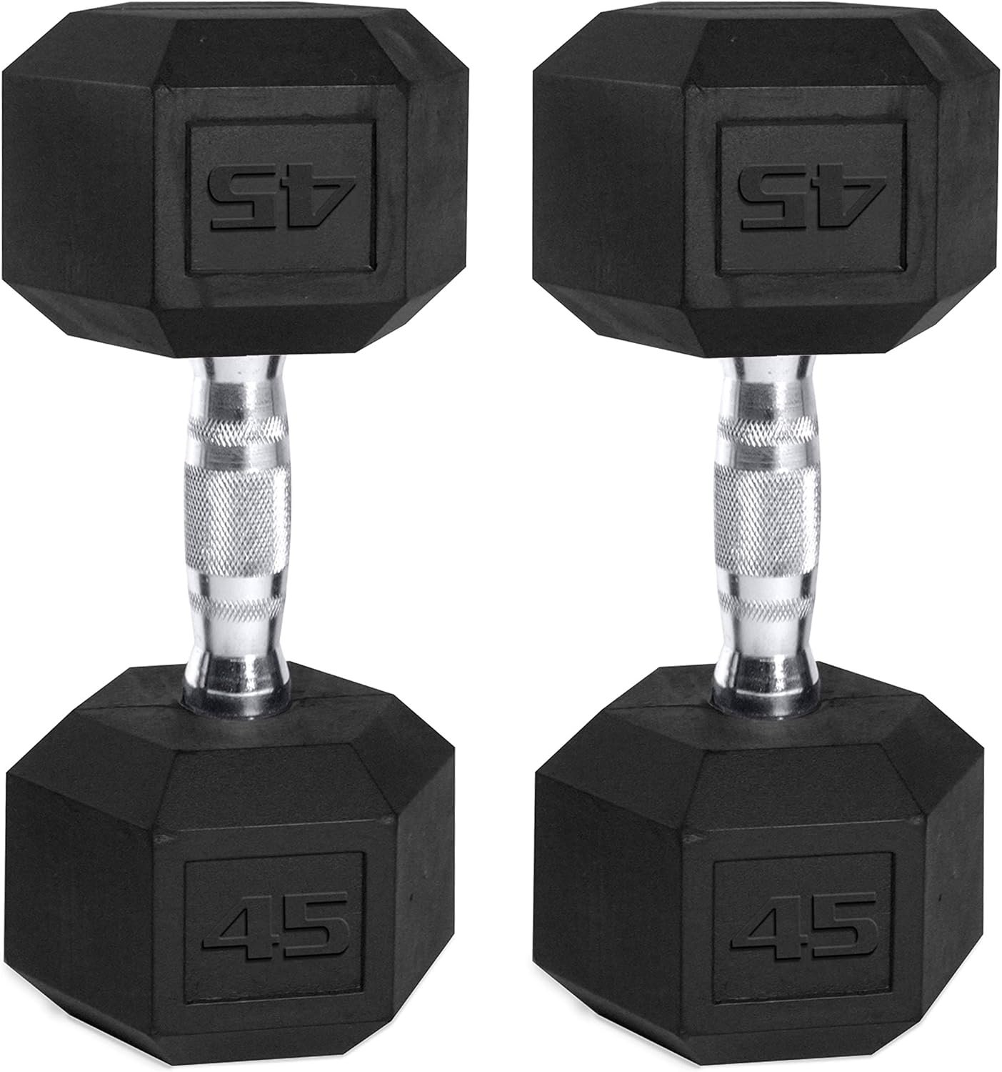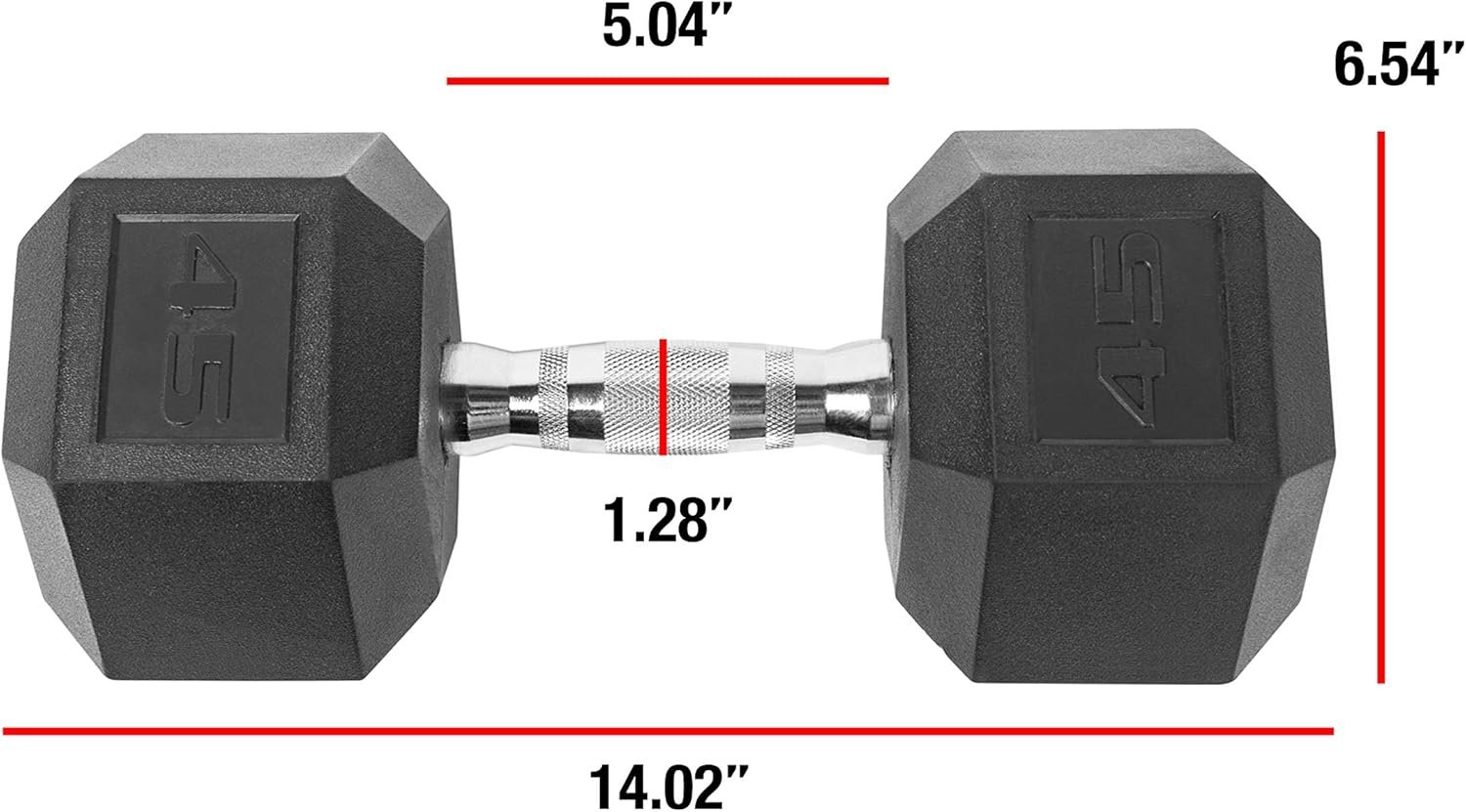CONSTRUCTION – Includes PAIR of 45 lb dumbbells. Dumbbell heads are made from ASTM A48 Class 20 grey iron coated in 80 shore hardness rubber joined together by a solid 1018 cold rolled steel chromed handle.