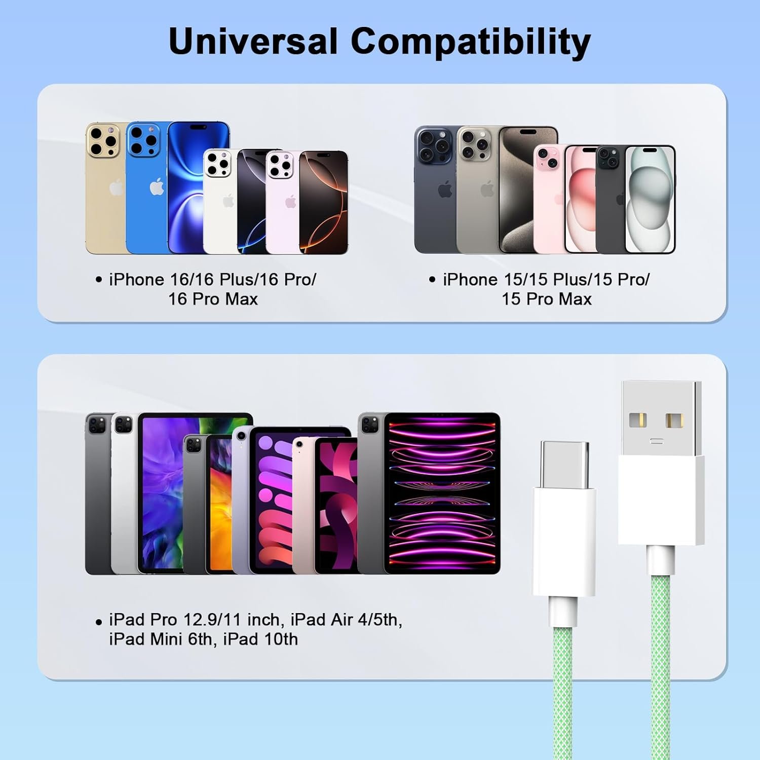 【Universal Compatibility】 Fast charge most USB-C , Tablet, cellphone to 50% in only 30 mins, fully compatible with iPhone 16/16 Plus/16 Pro/16 Pro Max/15/15 Plus/15 Pro/15 Pro Max, iPad Pro 12.9/11 inch, iPad Mini 4/5th, iPad Air 6th, iPad 10th, MacBook Air/Pro, Galaxy S24/S24+/S24 Ultra/S23/22/S21/S20 series, Pixel 8/7/6/5/4/3/2 and more USB C deivces.