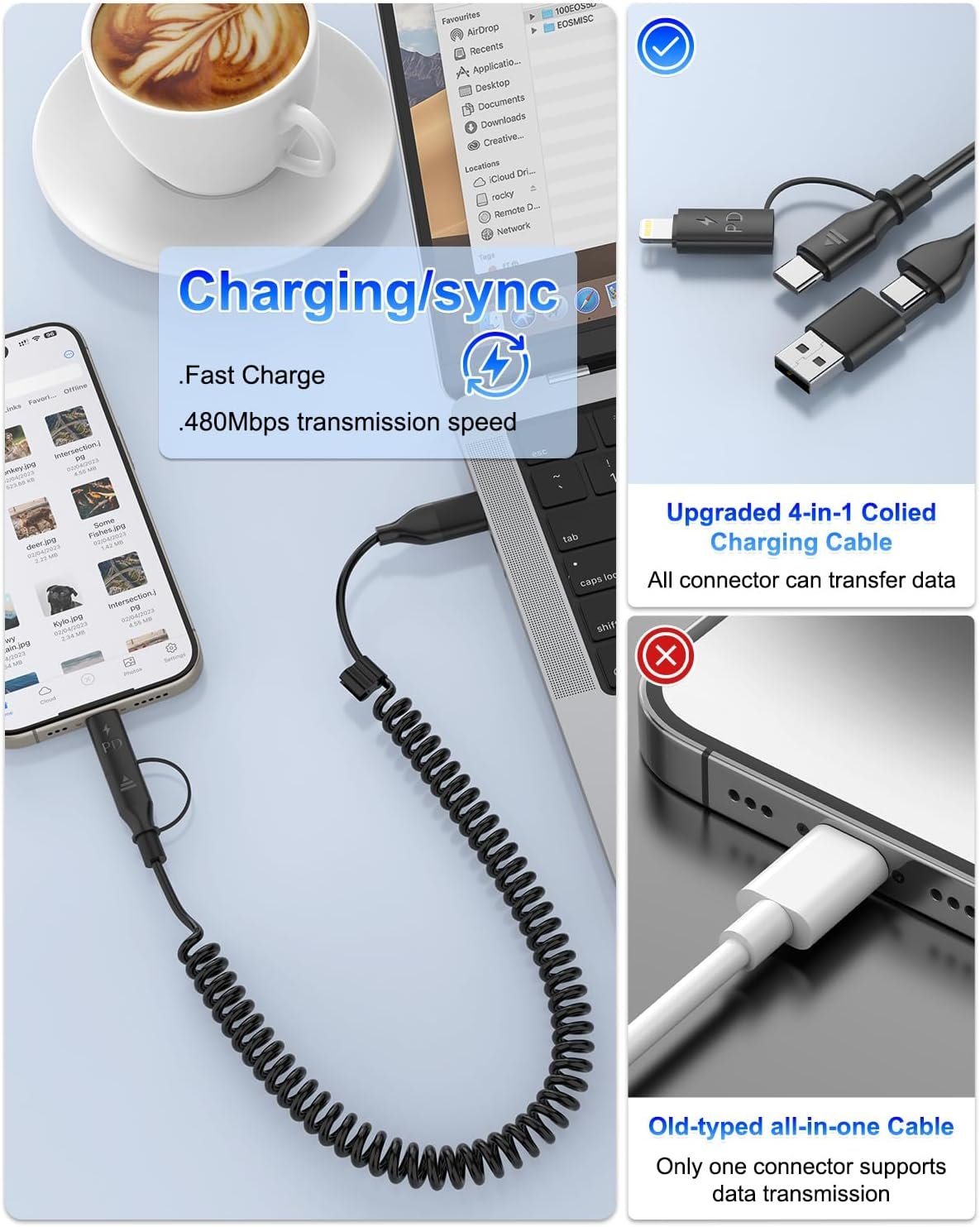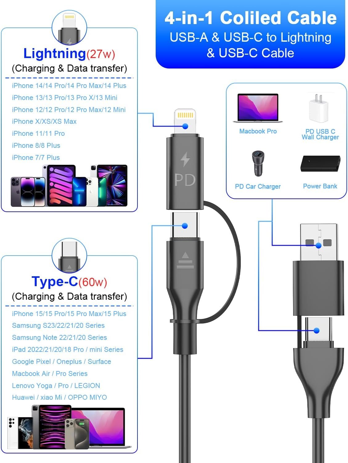 Fast Charging: 4-in-1 Coiled USB C and Lightning Cable Effortlessly charge your devices at high speeds of up to 60W with USB-C to USB-C, and 27W max with USB-C to lightning. Additionally, reveals inefficient data transfer up to 480Mbps, Is best Car charger cord for your iphone 15/16/14/samsung/Google.