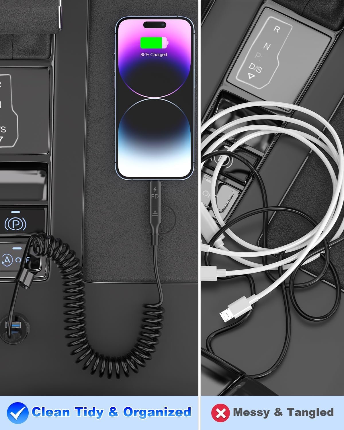 Carplay & Android Auto Cable: Short Coiled USB-C cable can fast charge for both usb-c device and lightning iphone. Support Apple Carplay and Android Auto both. 4 in 1 USB Ciphone 15 Cable allowing you to charge with any devices easily.