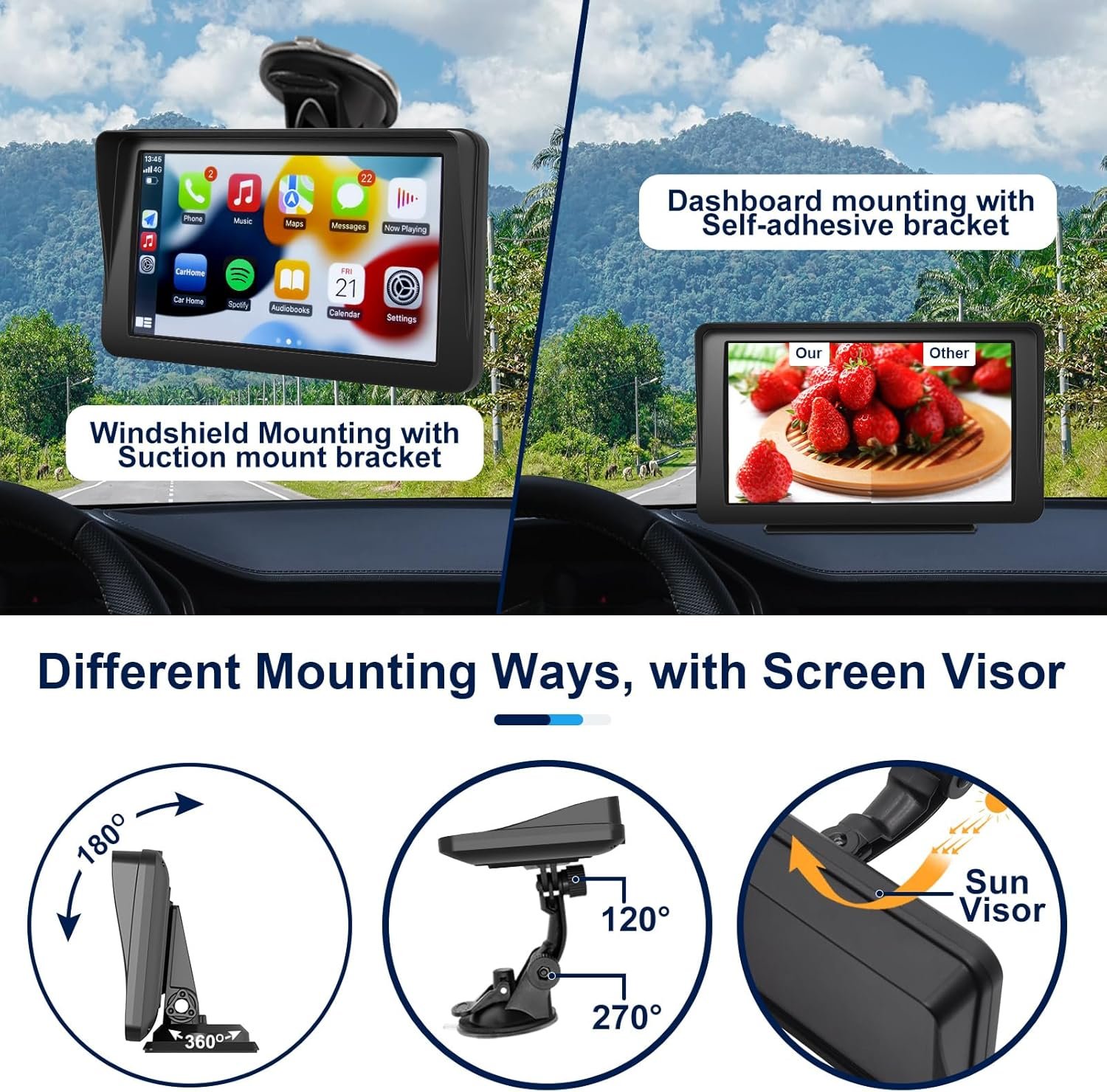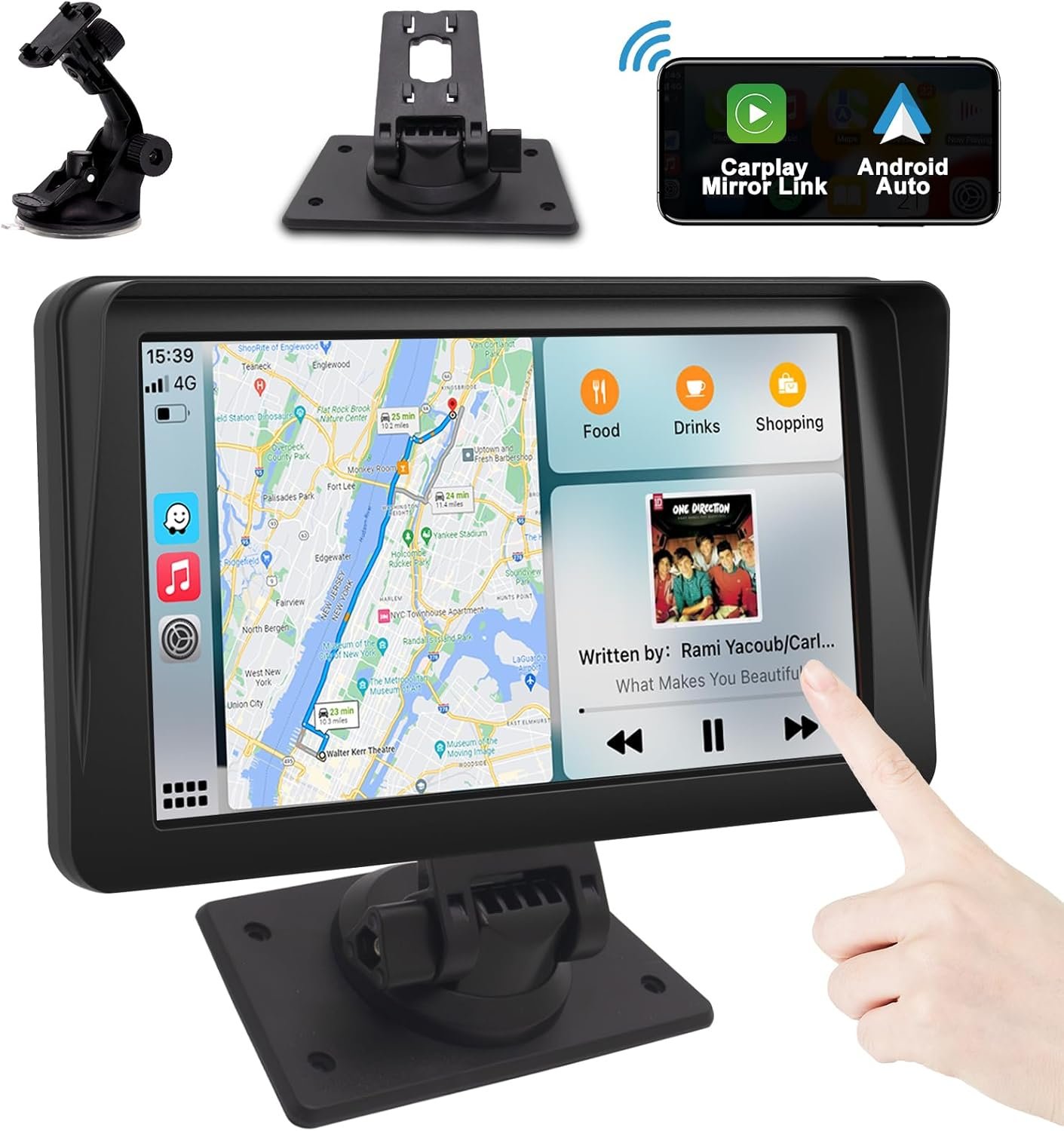 7-inch Full 1080P HD Capacitive touch screen.Supports Wireless & Wired Connections: Android auto & Apple CarPlay & Mirror Link for real-time map navigationSupports Bluetooth 5.0: Hands-free calling, drive more safelySupports Voice Controls: Apple Siri & Android voice control & GoogleAudio Output Modes: built-in audio, AUX connected to the car audio; FM wireless connection to the car audioAdaptive Voltage: 12V to 24VApplicable Car Models: Suitable for all models, including cars, trucks, buses and so on. Universal portable Carplay car stereo, regardless of model. You can add apple carplay to any car for navigation.Installation Type: Easy to install, Dashboard or Windshield by using a self-adhesive bracket and a suction cup bracket.