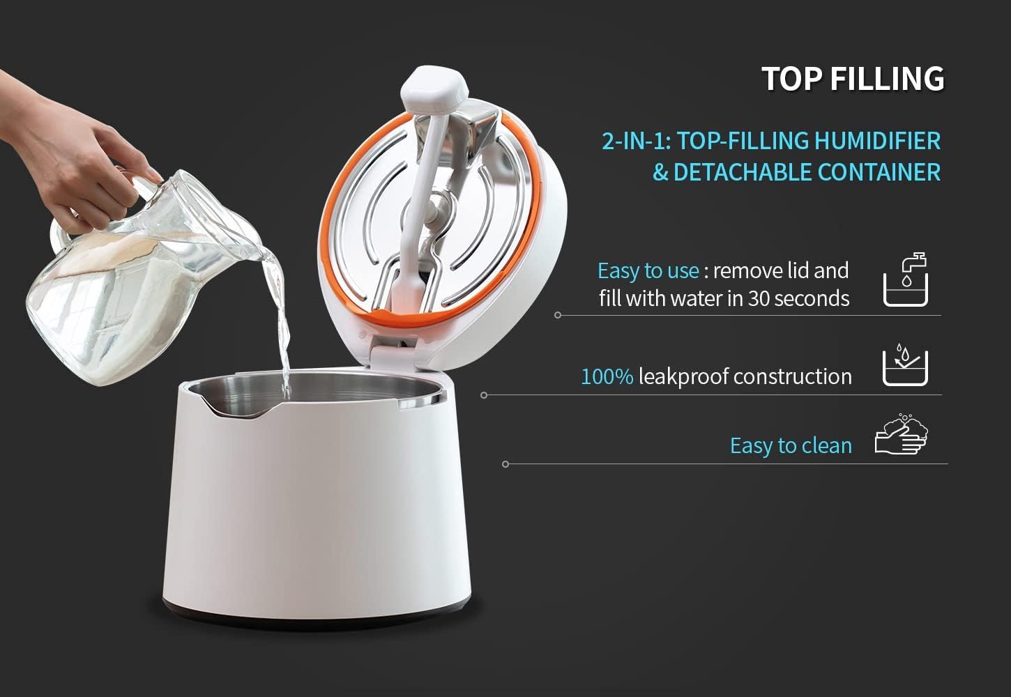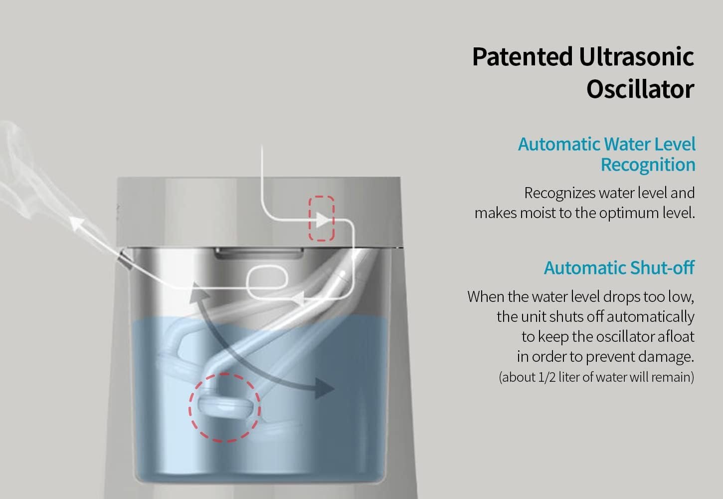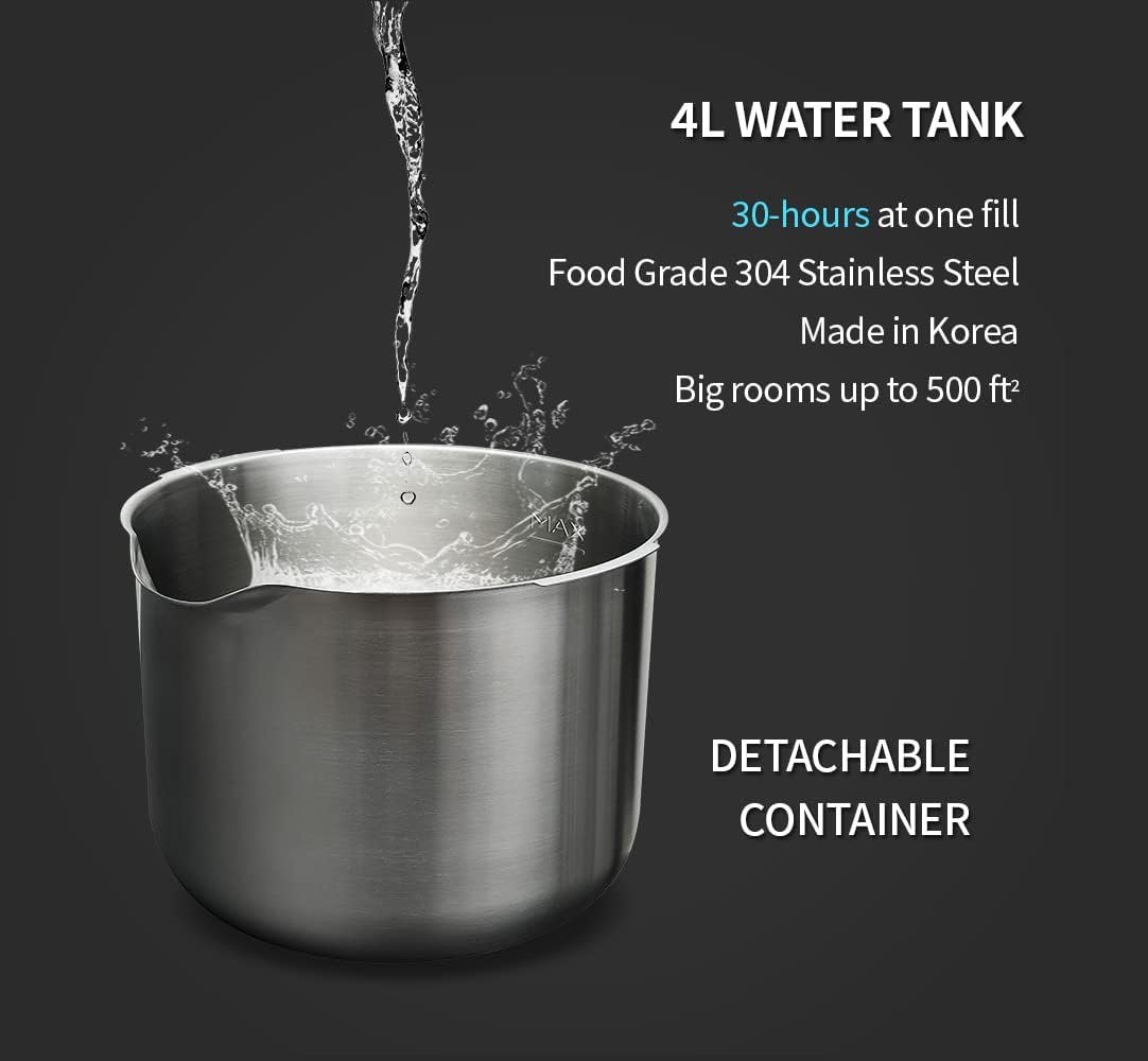 Rest Easy with Long Operation | Max 30 hours of continuous operation at humidity level 1 and max 10 hours of continuous operation at humidity level 3. Moisturizes air at max 300ml per hour. 3 level humidity Settings (100ml, 250ml, or 300ml)
